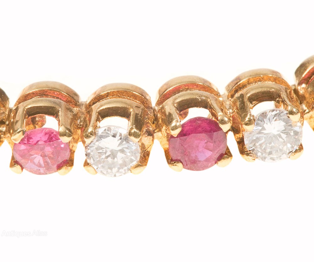 There are 24 lovely coloured rubies of 0.15 carat each ( Total approximately 3.60 carats) together with 24 bright white diamonds of 0.10 carat each (Total approximately 2.40 carats) all set in 18 carat yellow gold. The bracelet measures 3.25mm wide and 8 inches ( 21 cms) in length. It has a 9 carat yellow gold safety chain and the bracelet weighs 14.31 grams.