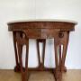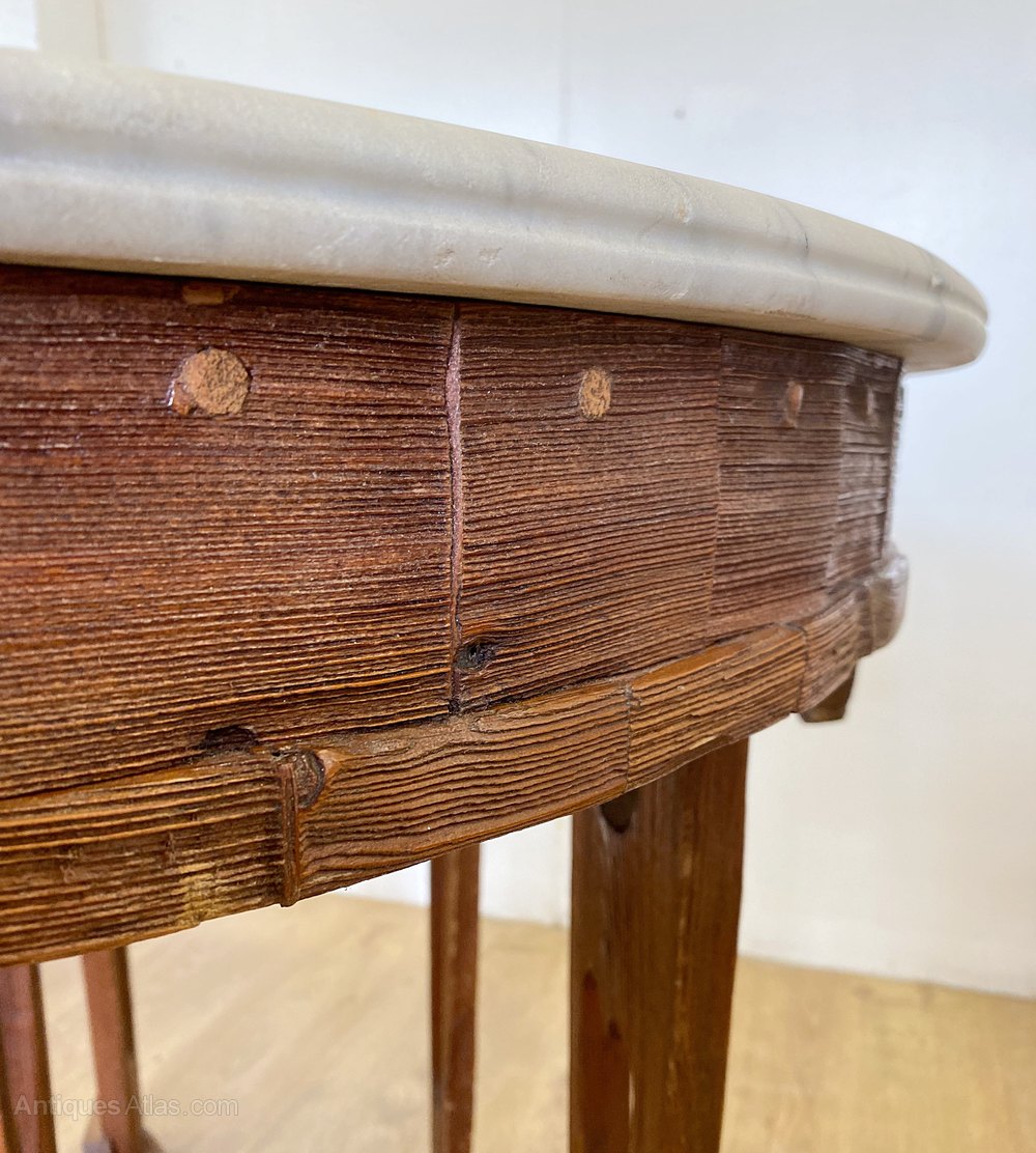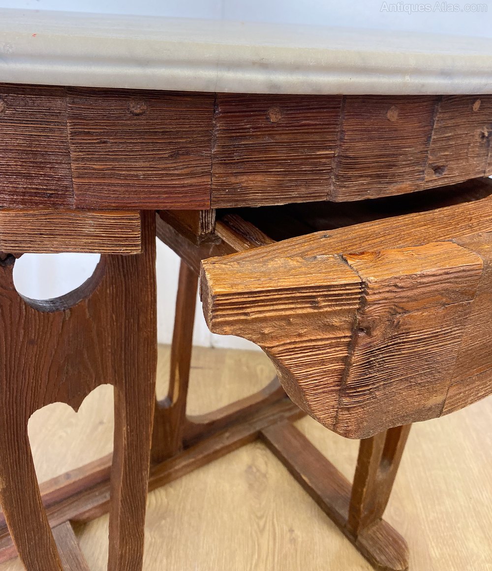 Marble top of semi circular shape sitting upon a curved frame supported by five fret cut legs. Single drawer to front. Continental in origin circa mid to late 19th century.