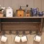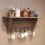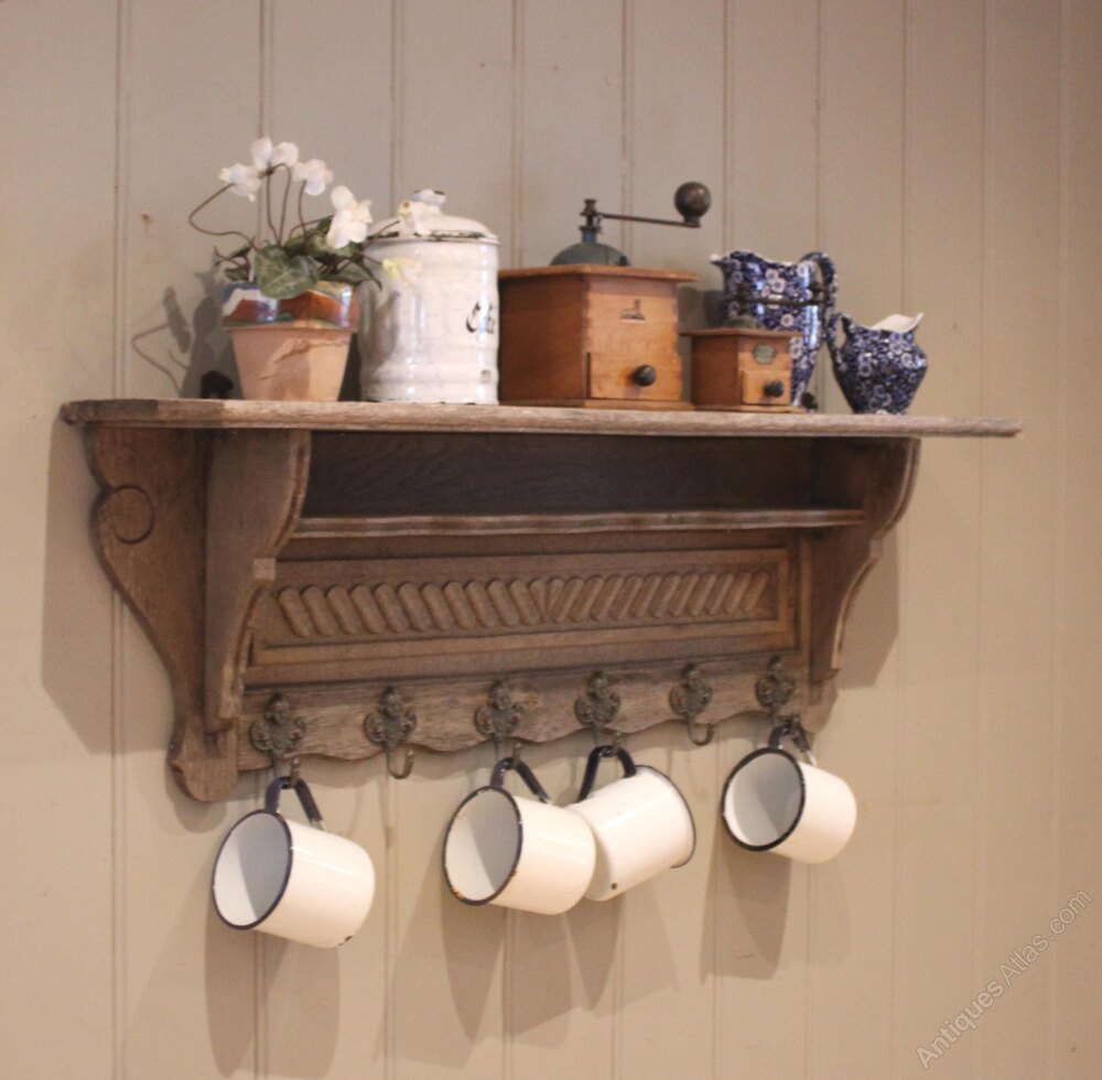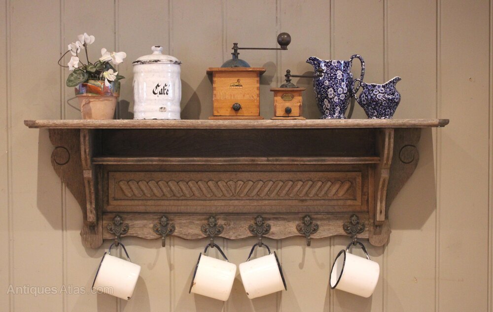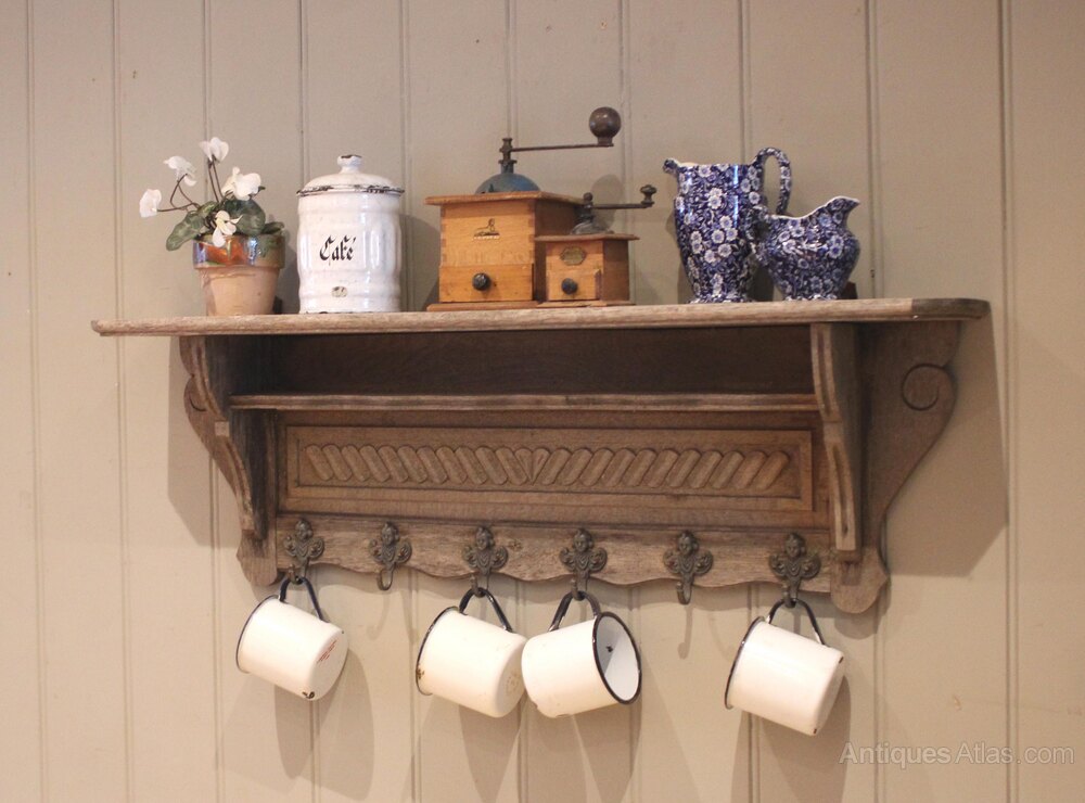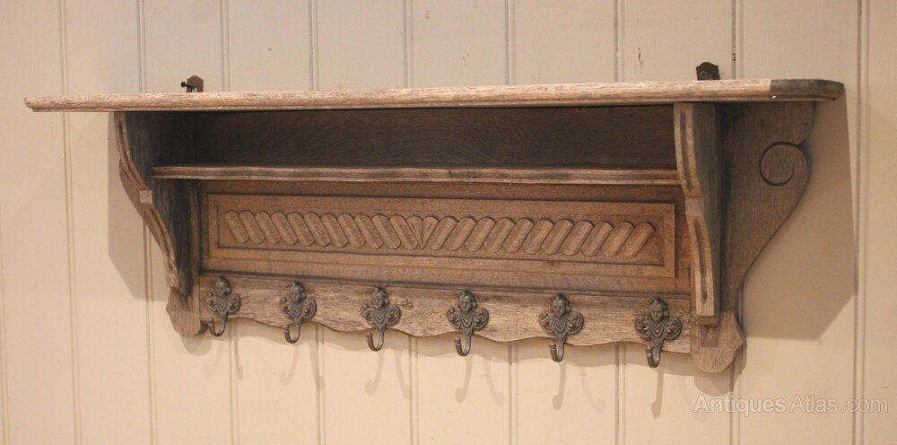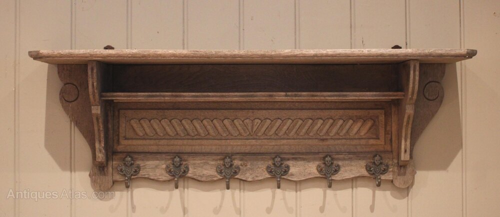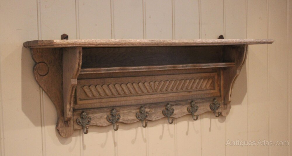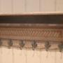 Rustic French wall shelf having a carved central panel with a row of six decorative coat hooks.