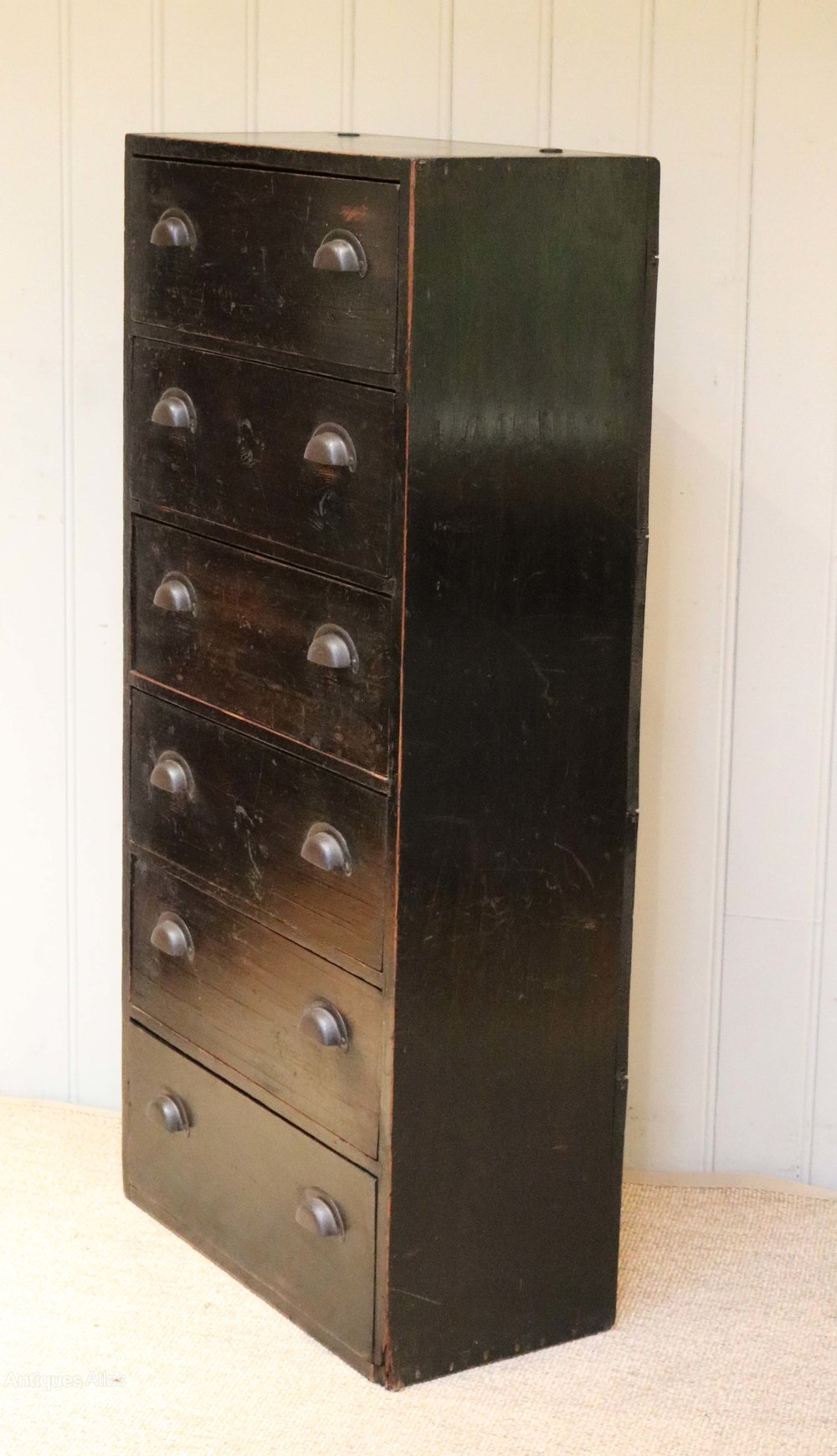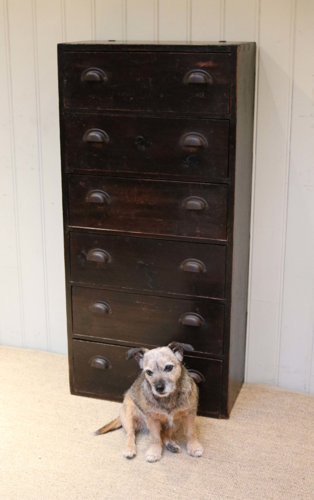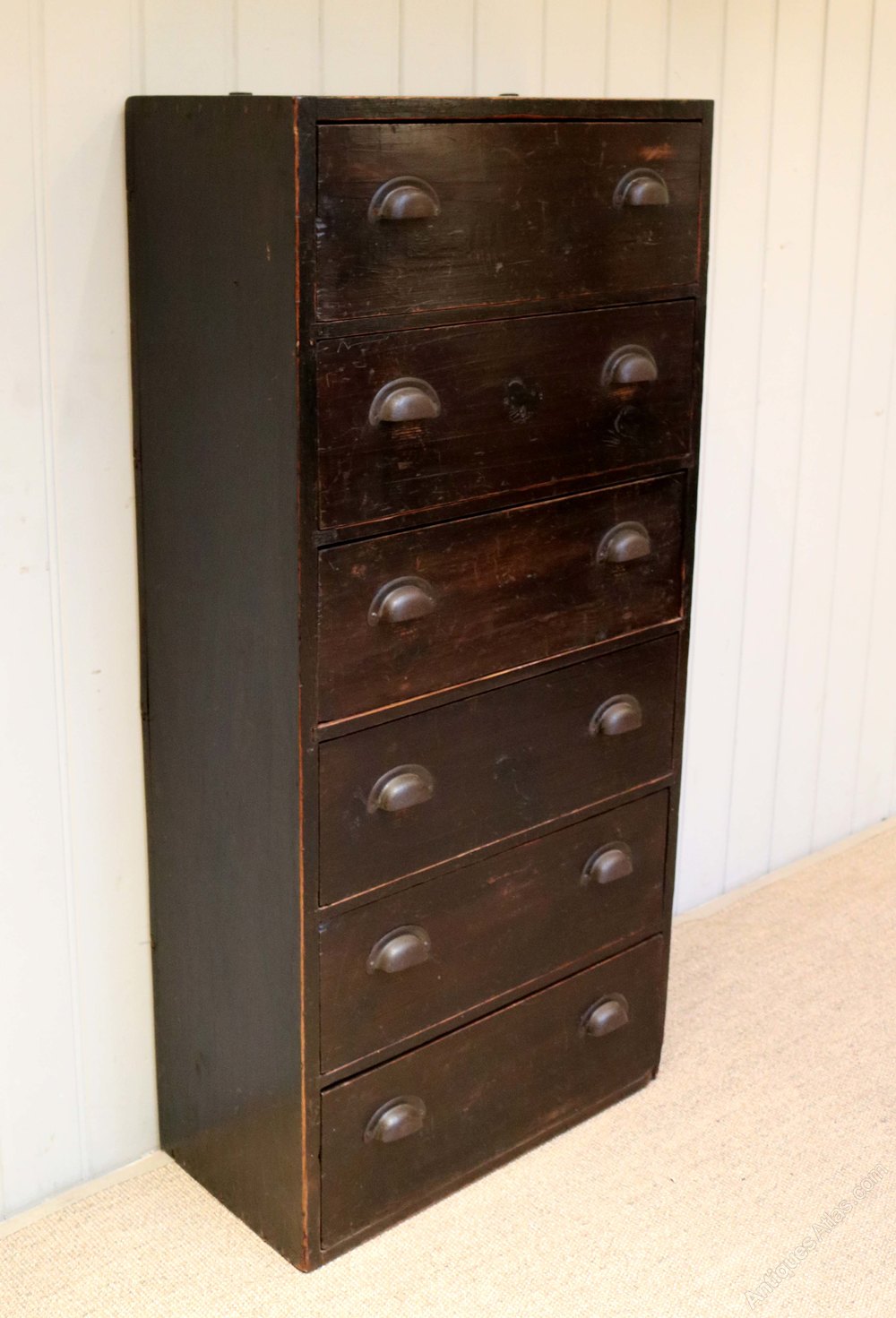 Rustic set of pine craftsmans drawers having six long drawers with cup handles and a black stain finish