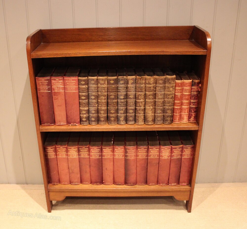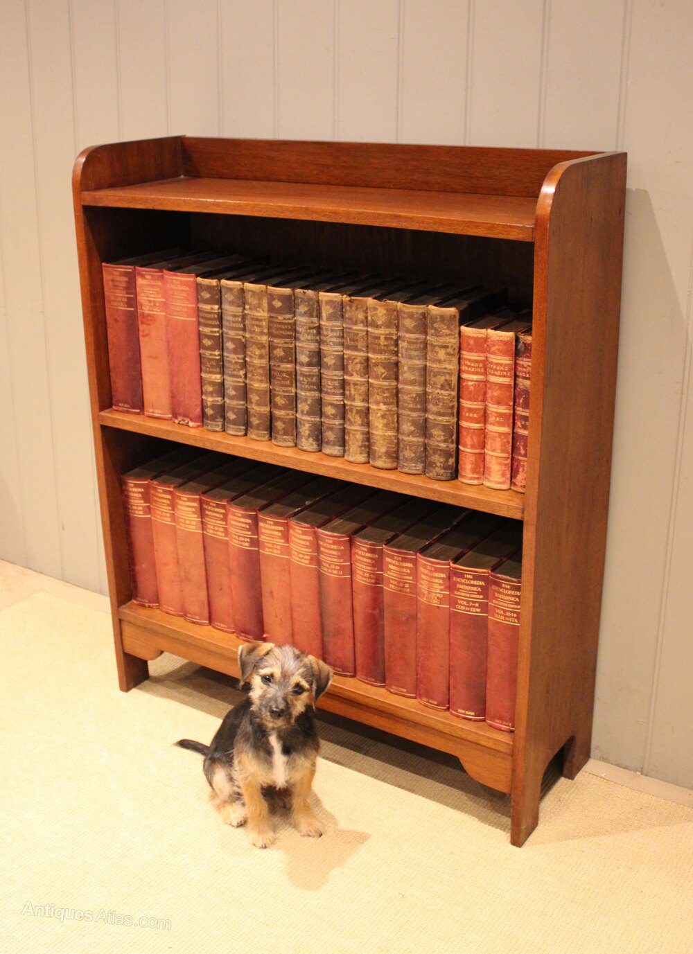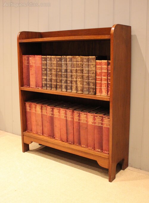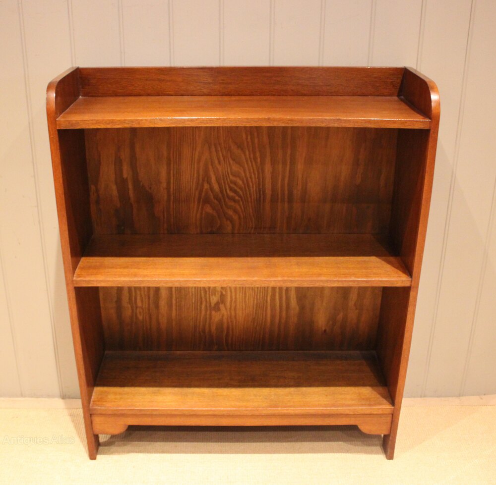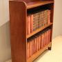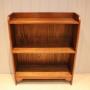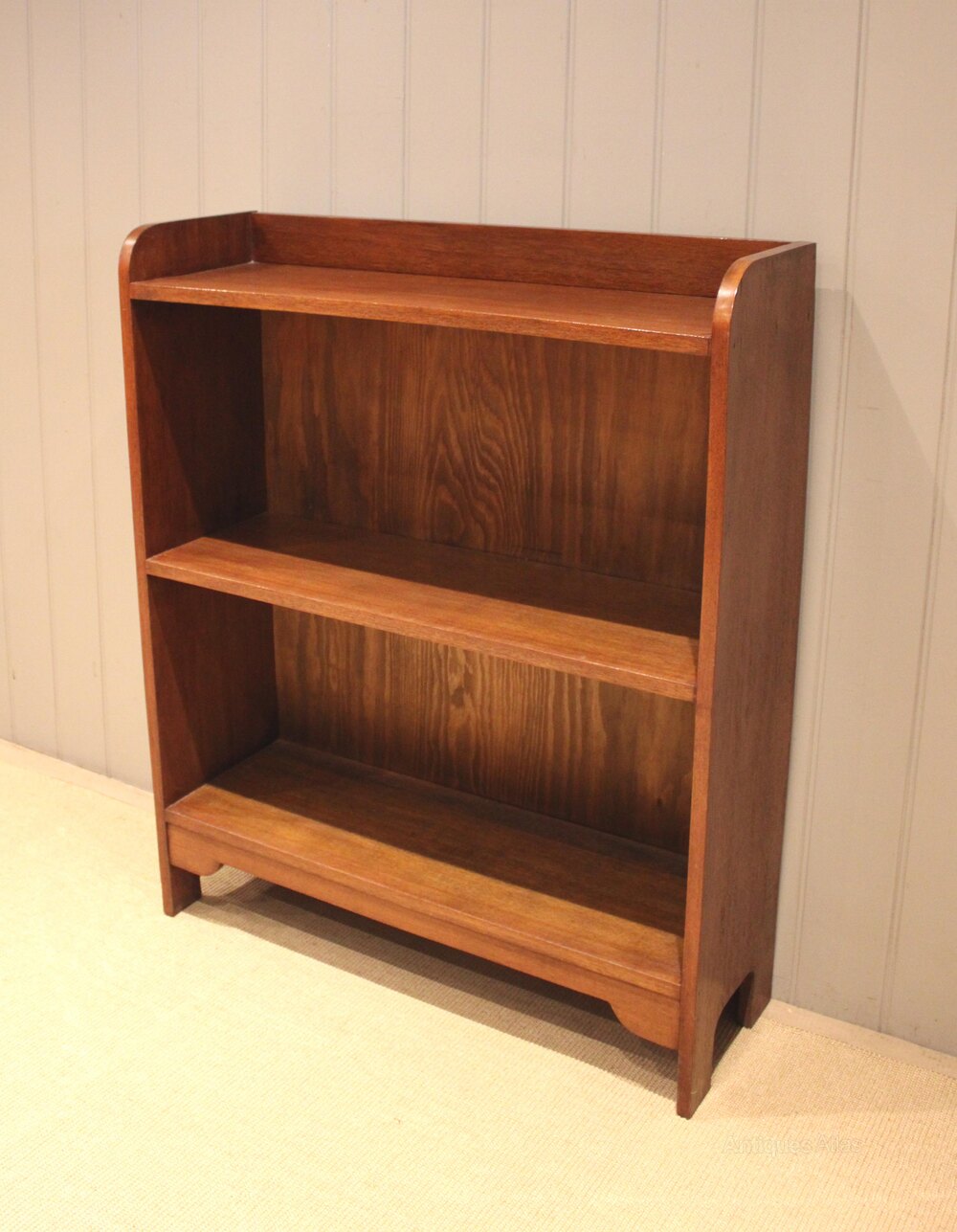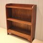Sapele open bookcase having two fixed shelves with a shaped apron and side bracket supports .