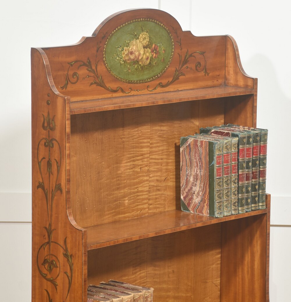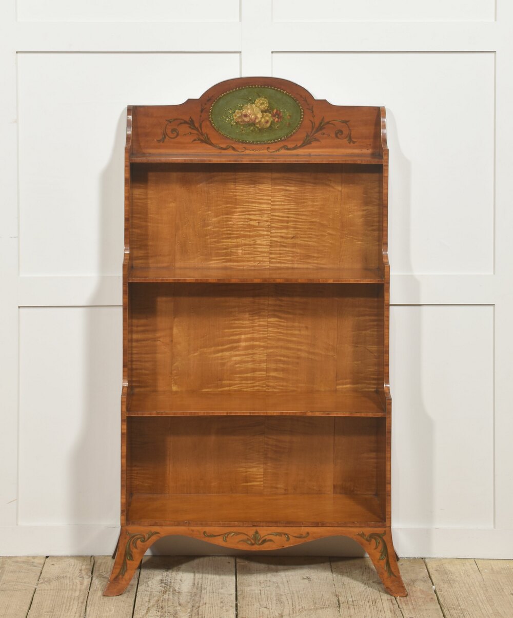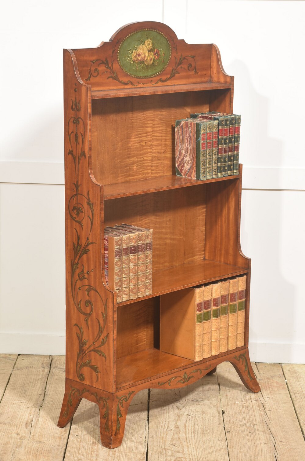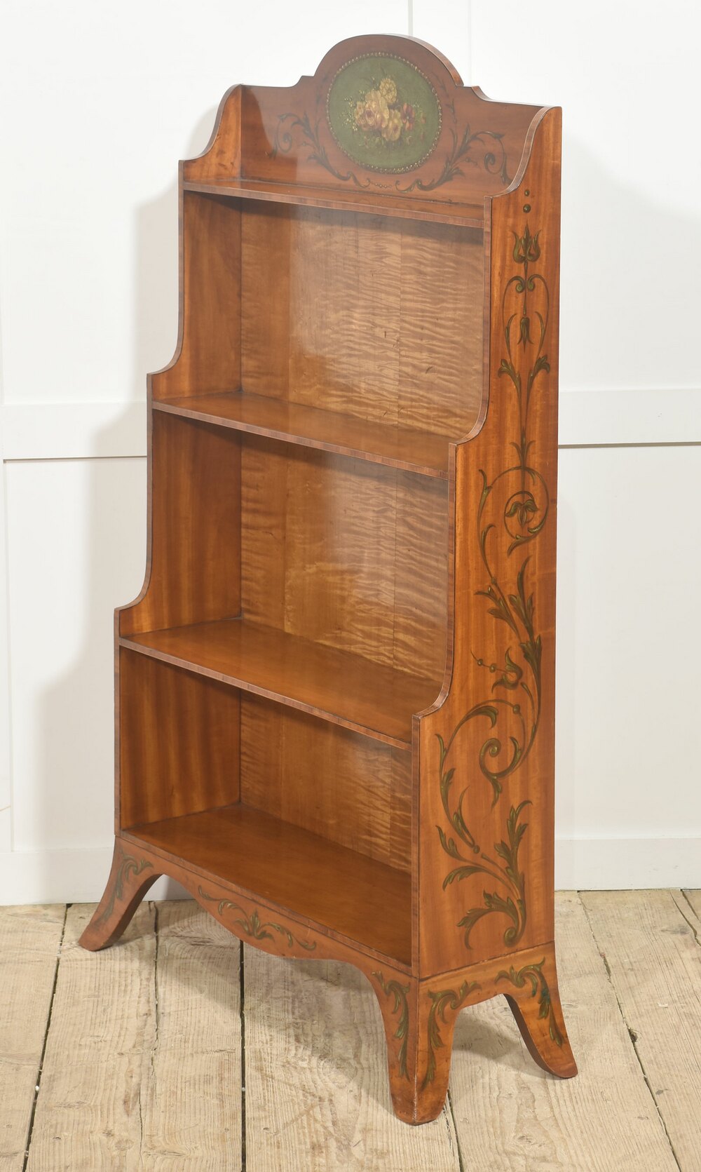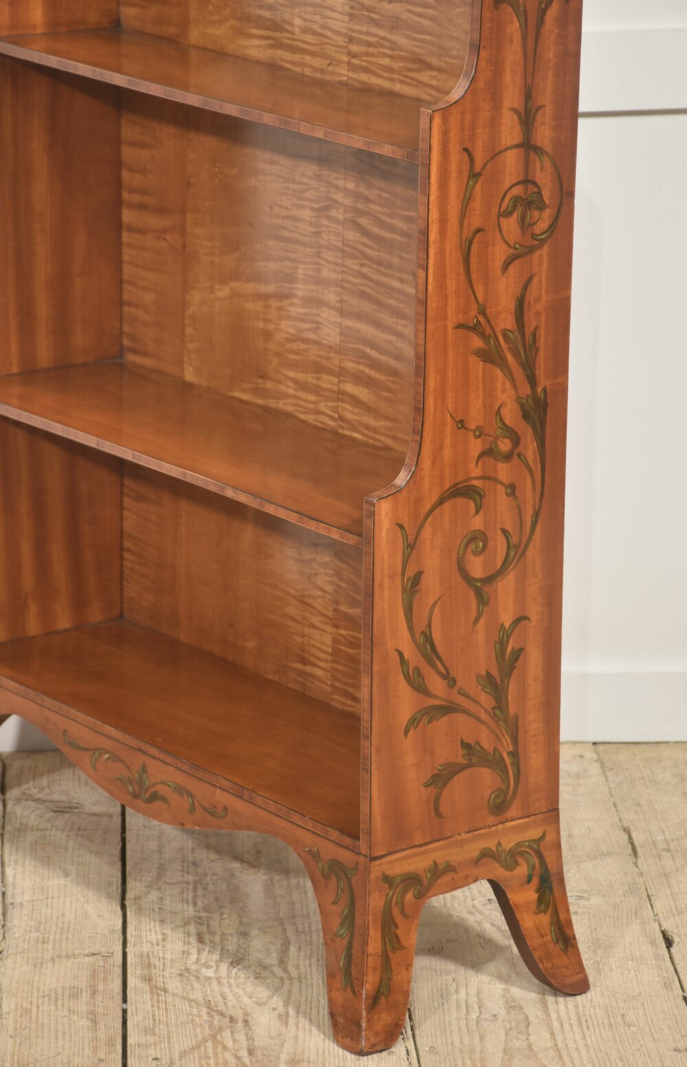 A finely made satinwood open bookcase, of elegant upright form, the bookcase is arranged with three open shelves above a deeper base compartment and stands on shaped bracket feet with a serpentine apron.