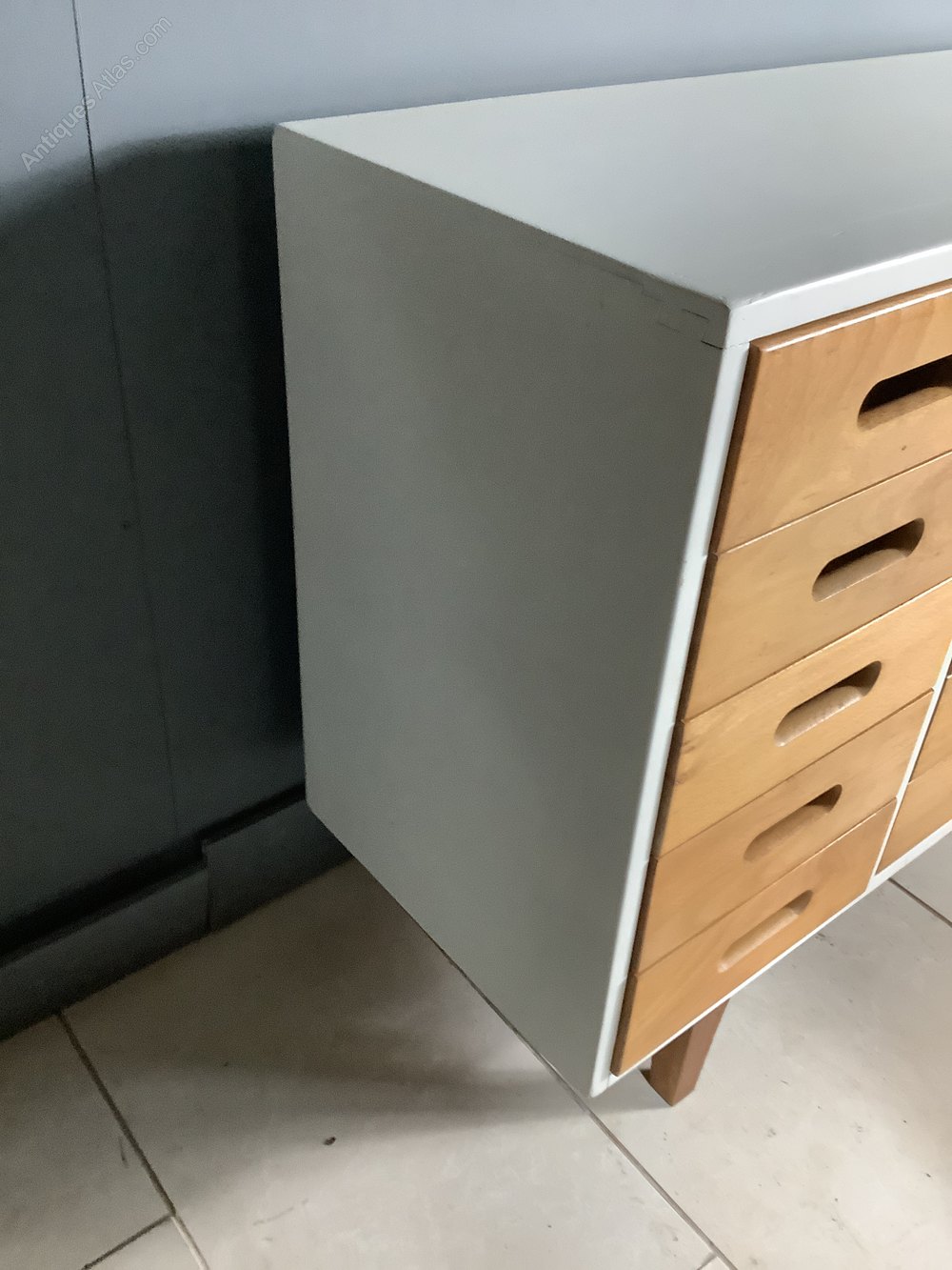 Condition This set of school drawers is in lovely condition all joints tight and ready to give many years of visual, enjoyable and practical years of use. The drawers have been stripped of the white paint and restored back to the beech. There is some slight bubbling to one side of the unit nothing we in the workshop felt required attention.