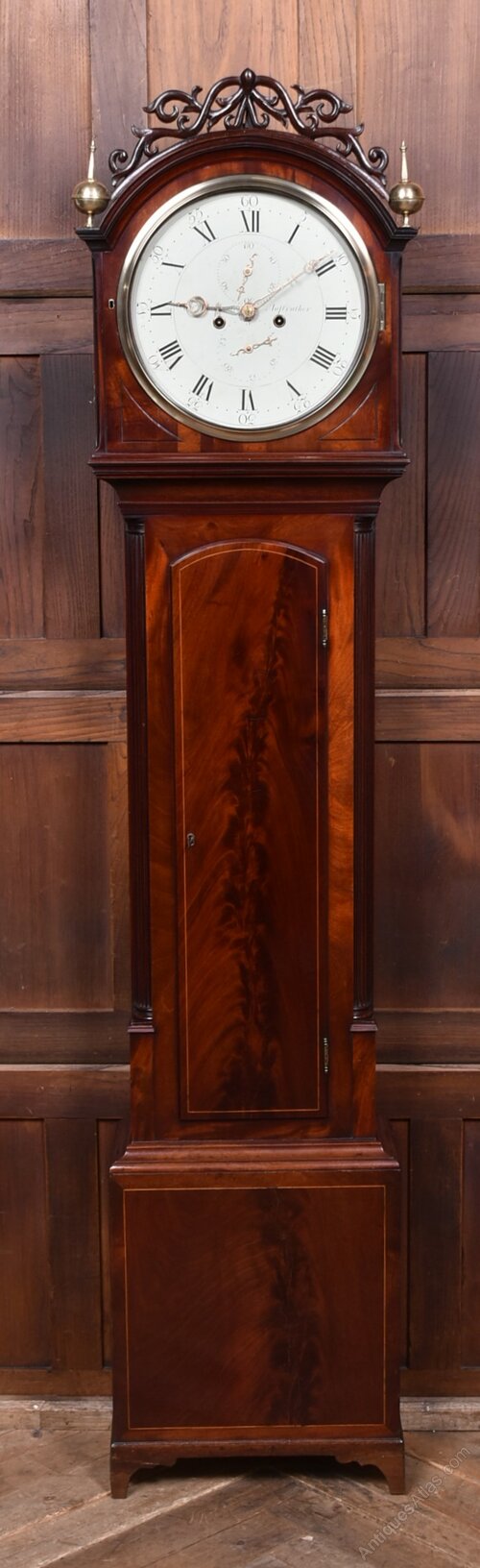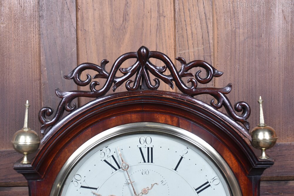 Exceptional early 19th‑century Scottish longcase clock in richly figured mahogany, signed Jn Adamson, Anstruther, a recorded East Neuk maker listed in Clockmakers & Watchmakers of Scotland. The clock presents beautifully, with a well‑proportioned mahogany case displaying deep graining and a warm, rich colouring. The hood is crowned with carved cresting and turned finials, framing an elegant silvered dial with Roman numerals, subsidiary seconds, and a date aperture. The hands are finely pierced and typical of the period. Importantly, it is fitted with a dead‑beat escapement , this type of escapement is most often associated with higher‑quality longcase clocks and favoured by better 19th‑century clockmakers. The movement has been fully overhauled and serviced, and the clock is in excellent working order. A very attractive and well‑made East Neuk example, combining fine casework, a clean and readable dial, and a technically superior movement.