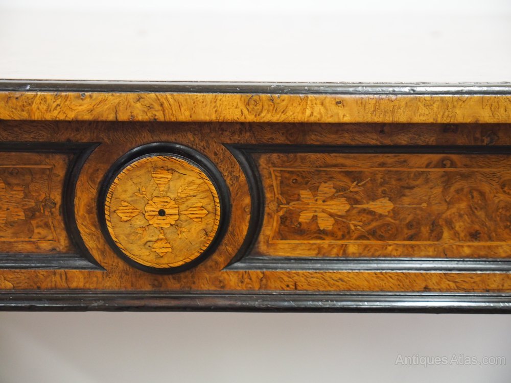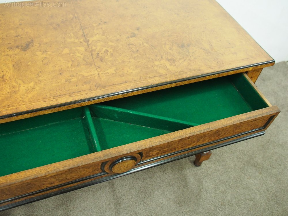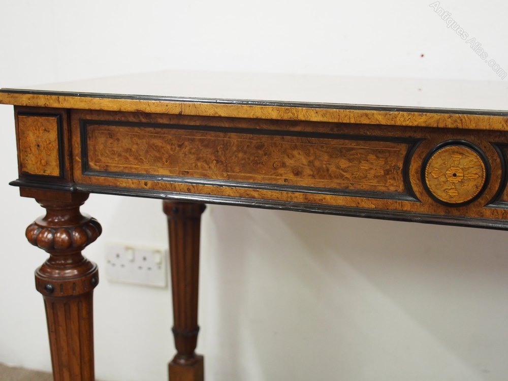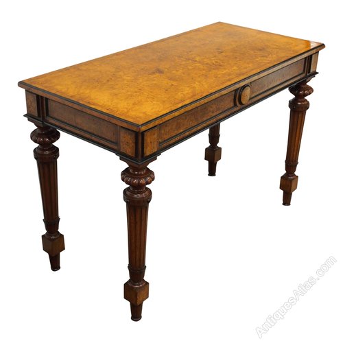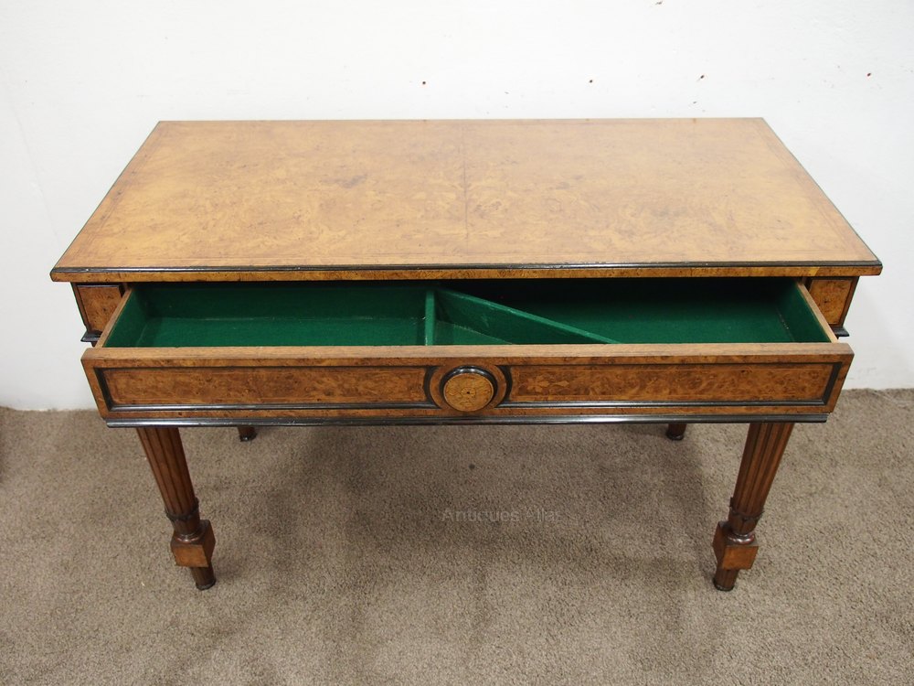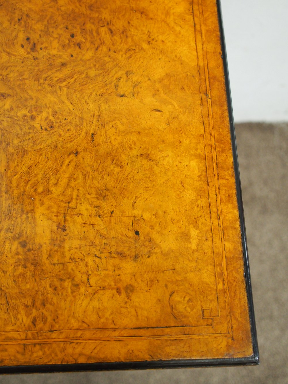 Circa 1820, Exhibition quality Scottish Regency pollard oak side table. The rectangular top is in mirror matched, highly figured pollard oak with straight-grain oak line inlay. There are ebonised and crossbanded edges and it has a panelled frieze with ebonised mouldings including a full-length drawer. It has double marquetry and string inlaid panels to the drawer and a central inlaid roundel. There are turned and fluted legs with acanthus carvings above an inlaid block and tapered fluted feet.