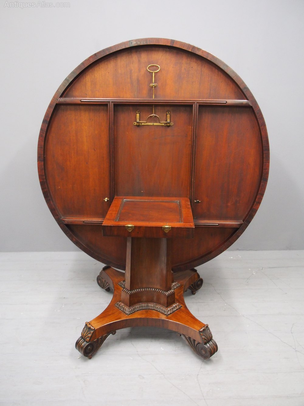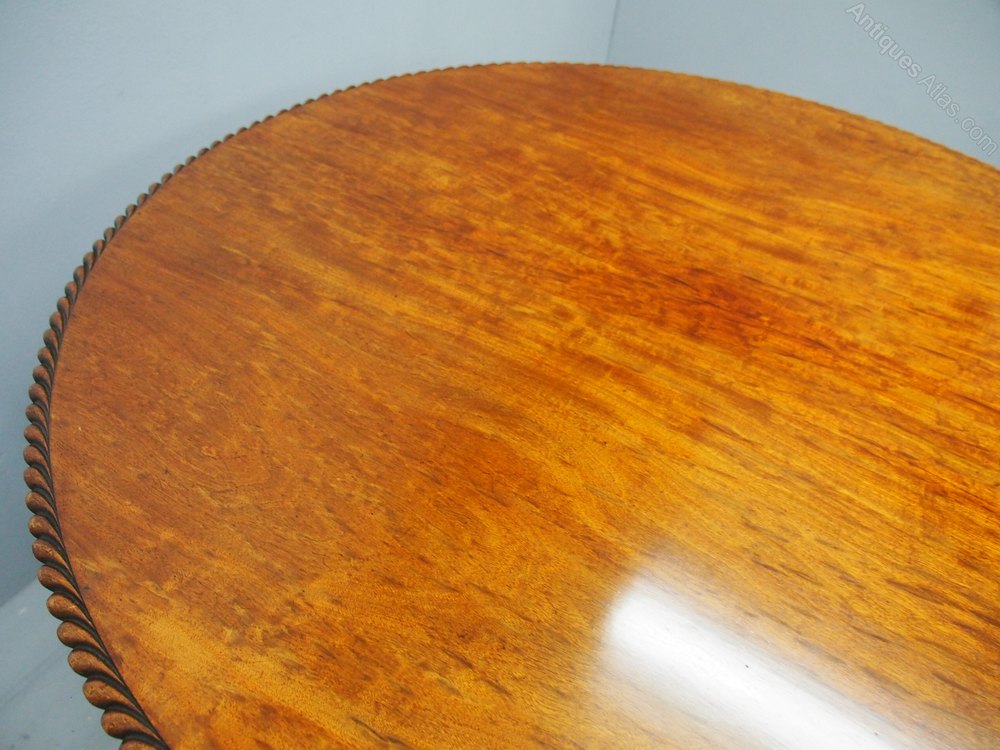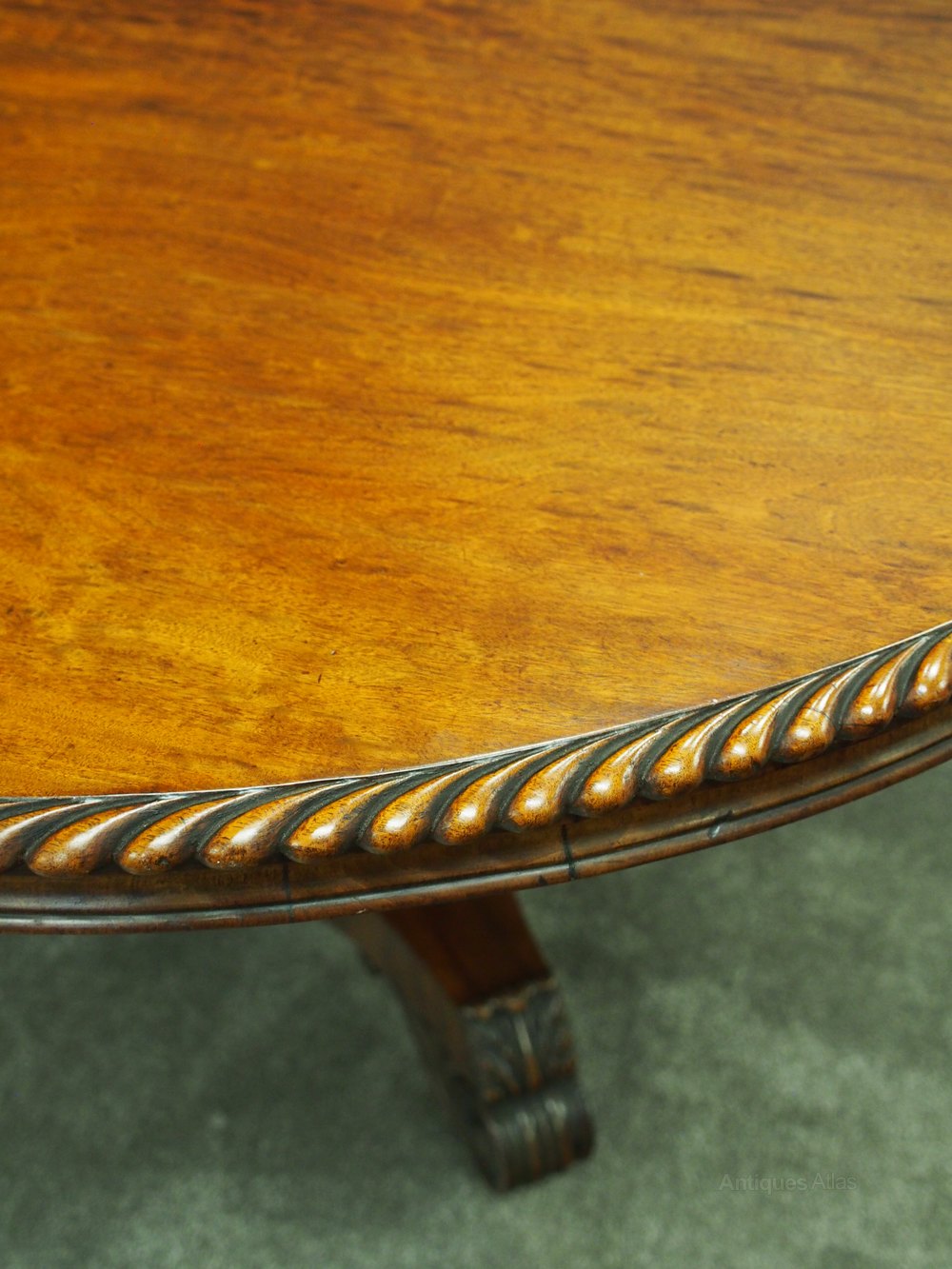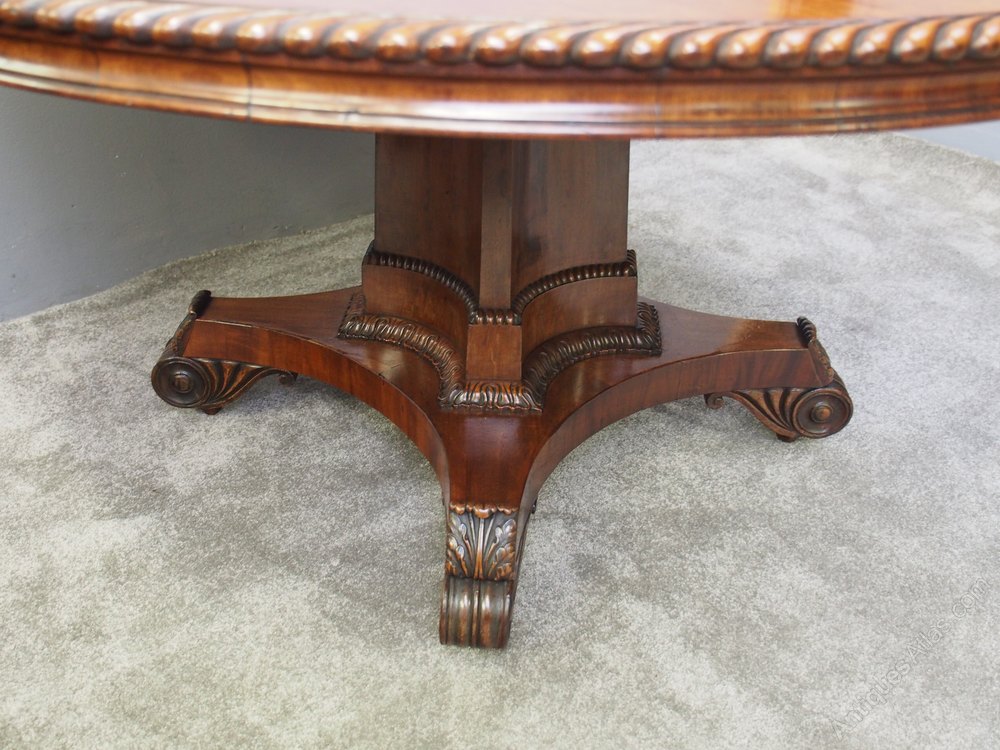 Circa 1820, exhibition quality Scottish William IV tilt top circular breakfast table, possibly by Mein of Kelso. The top has a carved gadroon edge in plum pudding mahogany and is supported on an unusual tapering, concave, two-part pillar with acanthus carved collar. This is over a shaped quadripartite plinth base with acanthus carved feet, with hidden brass and porcelain castors.