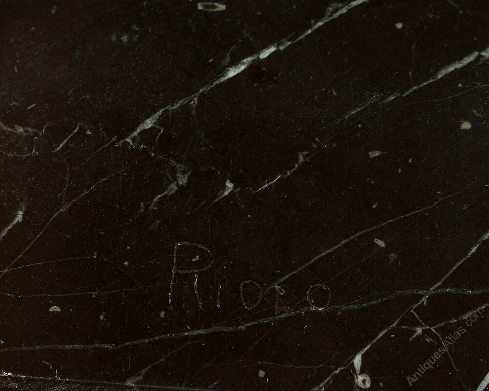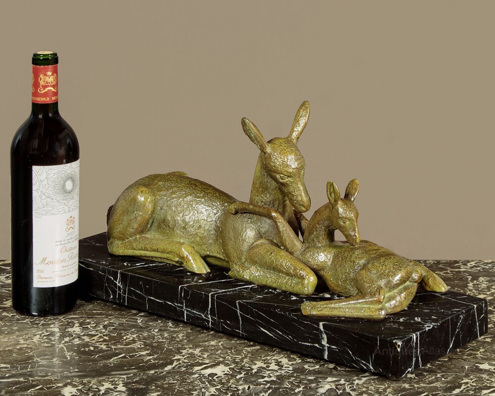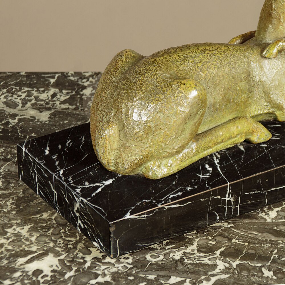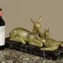 Mid 20th.c. table top sculpture of a doe and its fawn c.1950. Cast in spelter with textured surface an good green bronze coloured finish. Presented on a well figured black marble base with chromed feet below. Signed Riolo on the corner of the marble. A few very small chips from the edges of the marble, otherwise very good condition. Cleaned and waxed in our workshops.