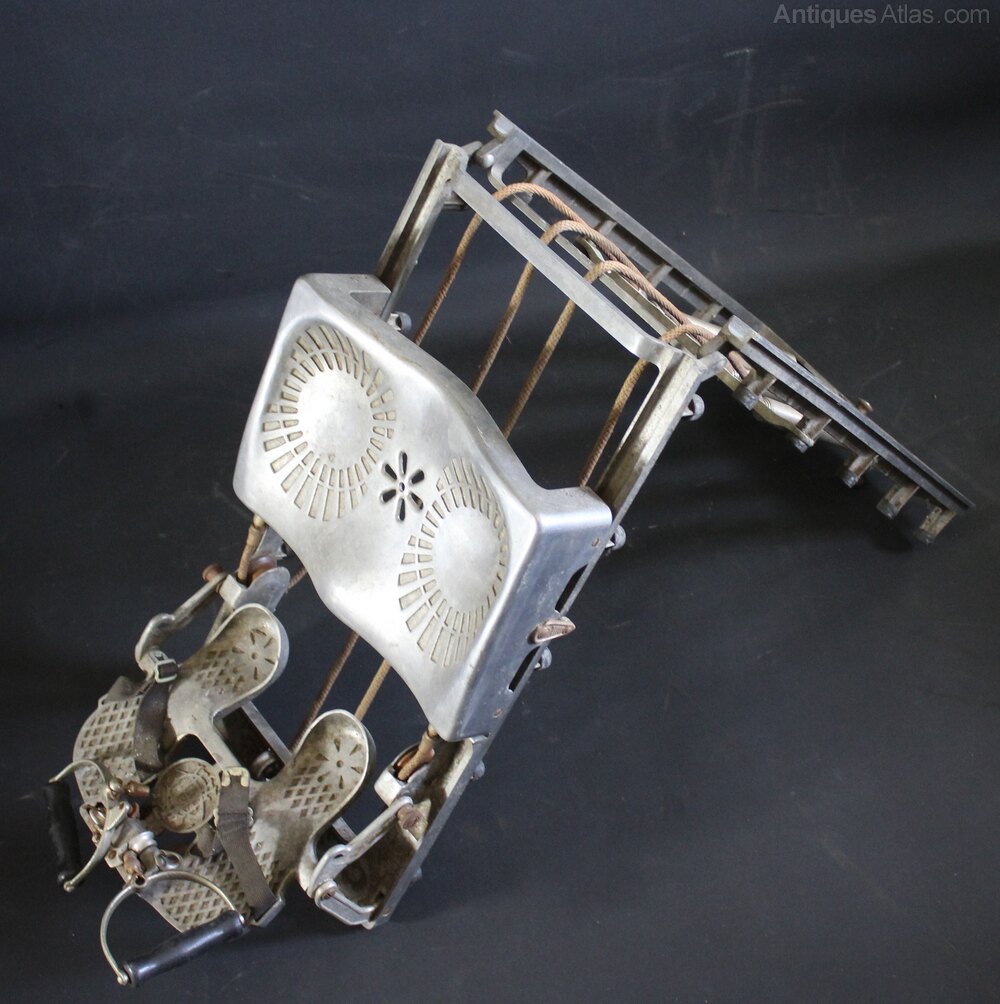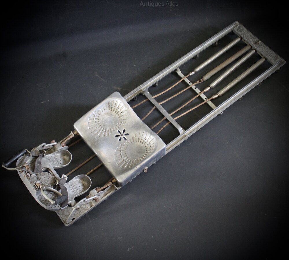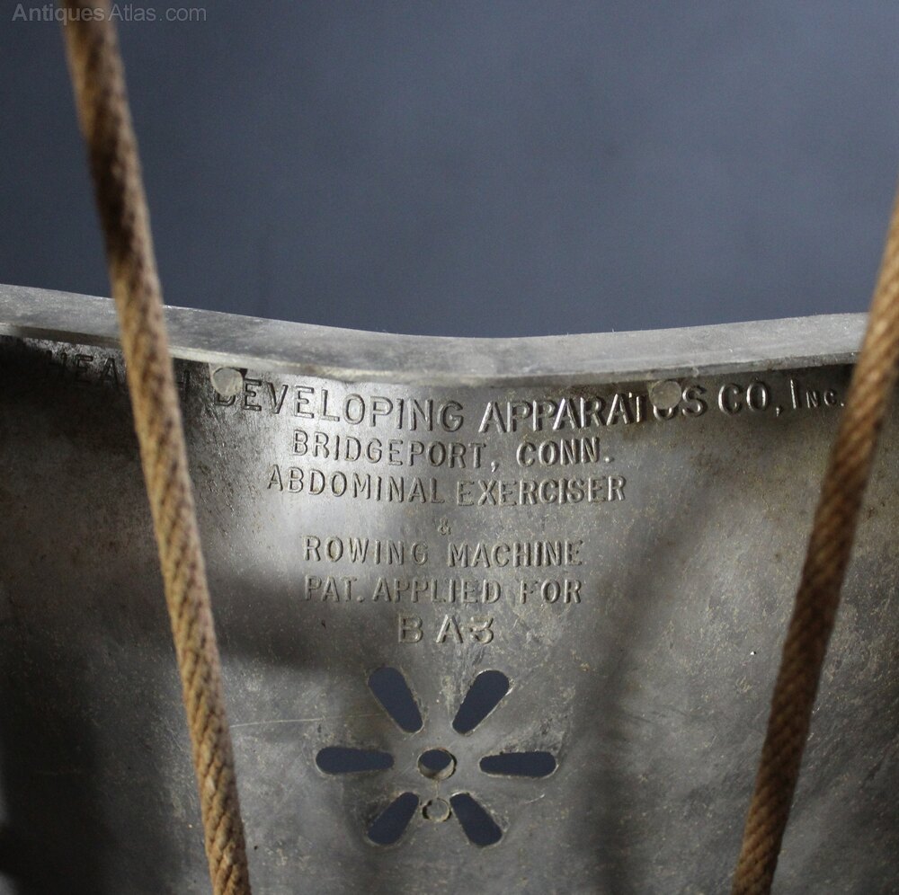 Well designed early 20th century collapsible rowing machine exerciser manufactured by the Health Developing Apparatus Co., inc., Bridgeport, Conn. Made of lightweight aluminum which also makes it perfect to hang up as unique vintage wall art. When fully extended the machine measures 126 cm x 33 cm x 22 cm high. Folded is 62 cm