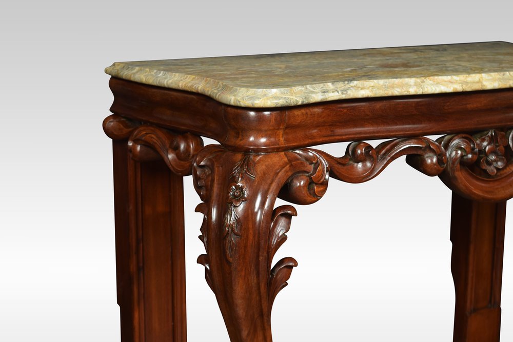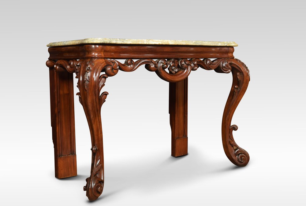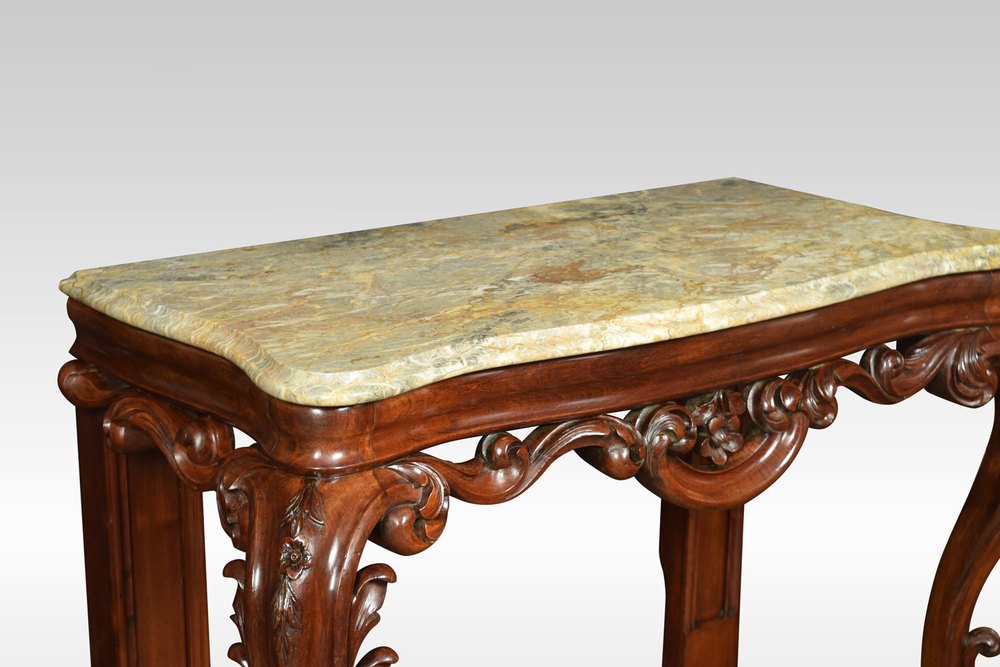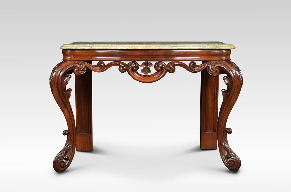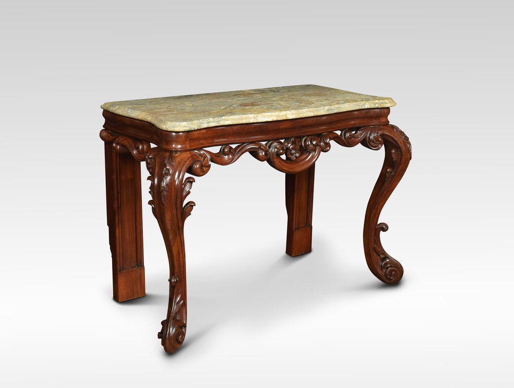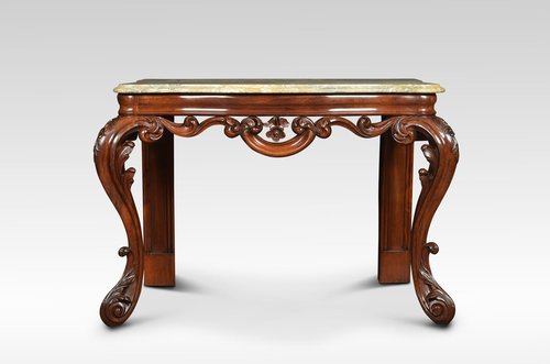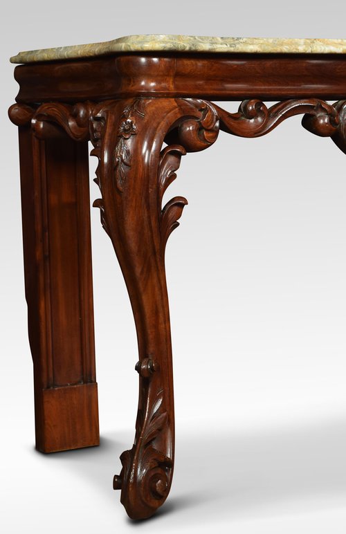 19th century mahogany console table the serpentine shaped vined marble top above moulded freeze supported on scrolling cabriole front legs leading down to acanthus caped scrolling feet.