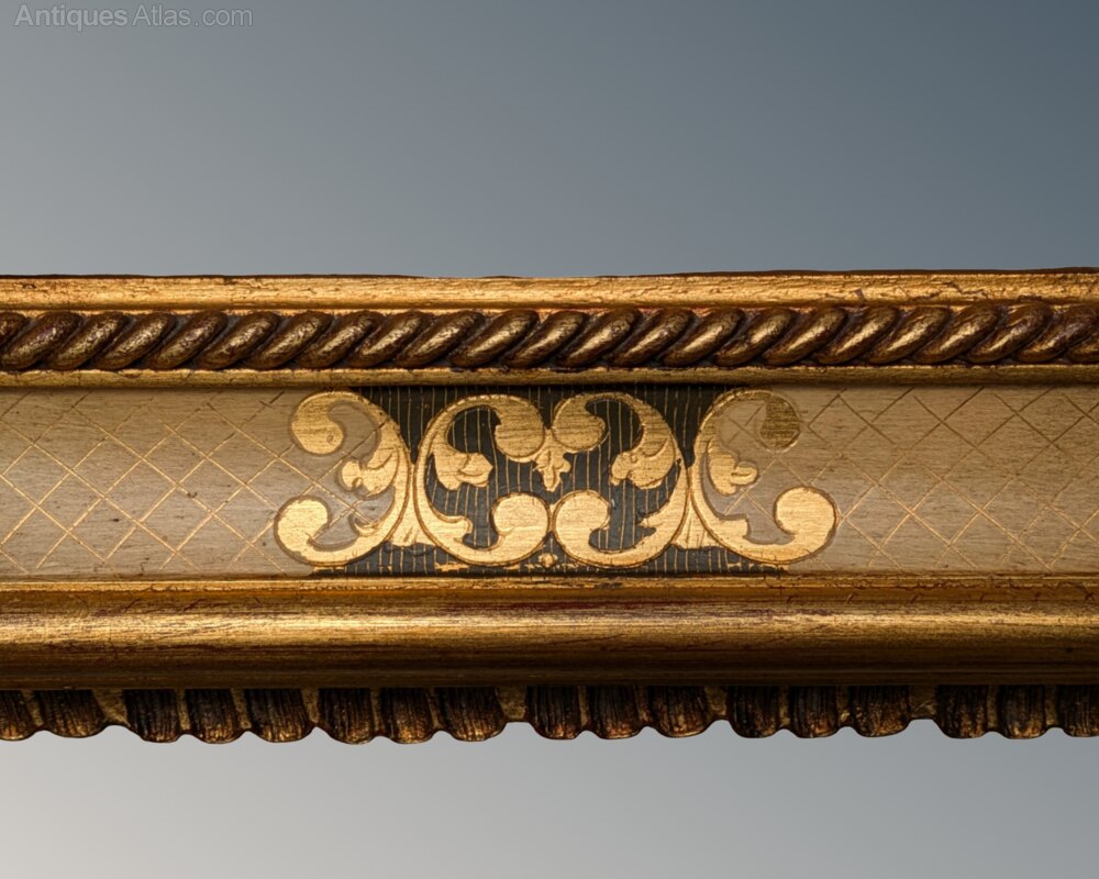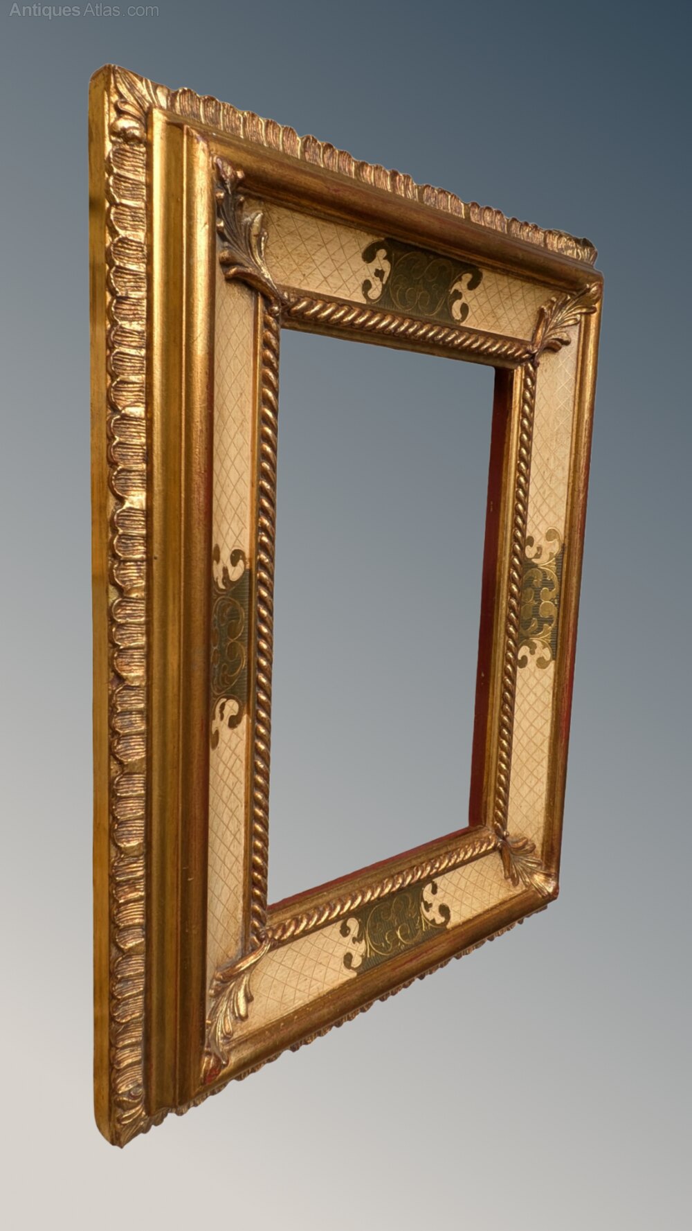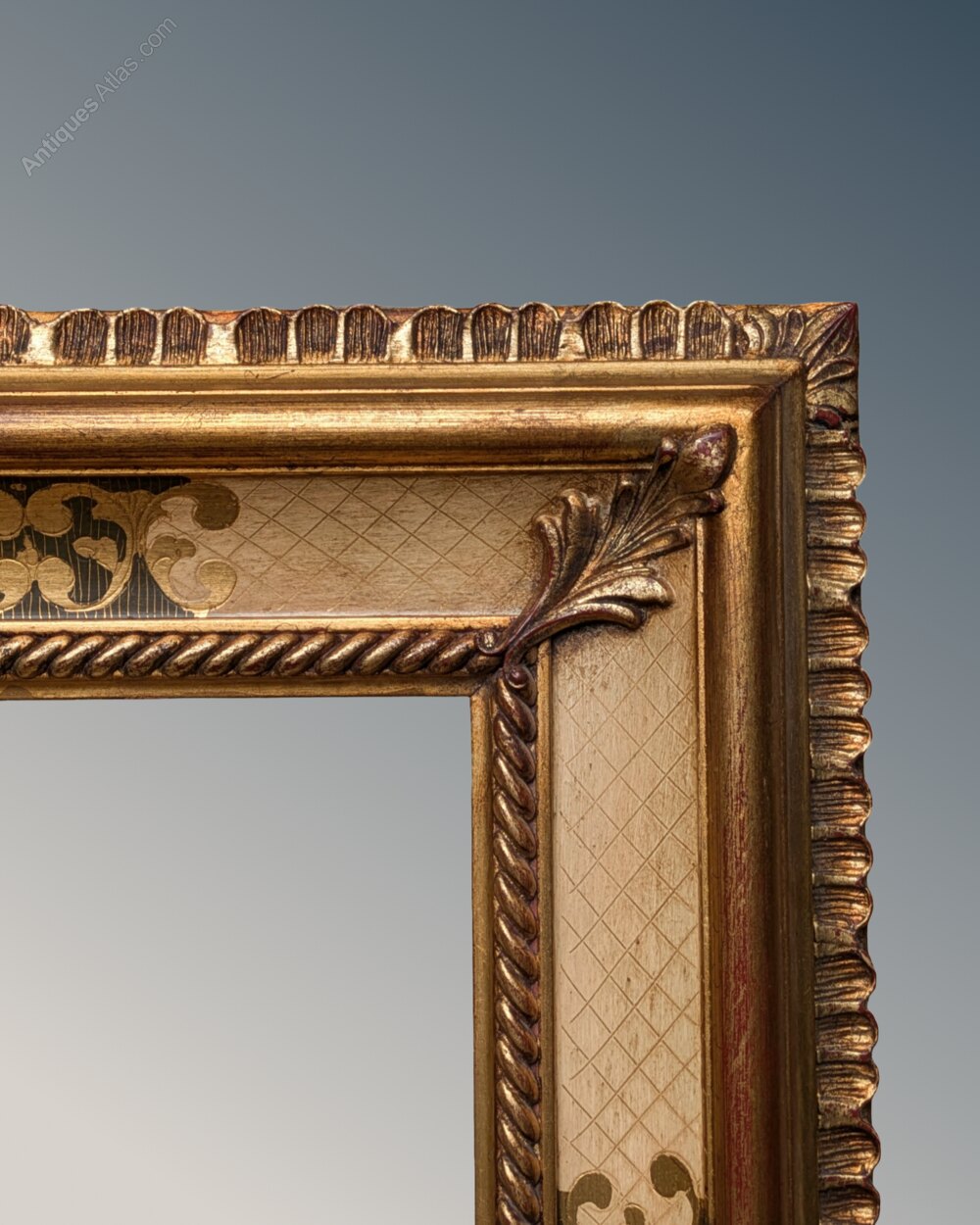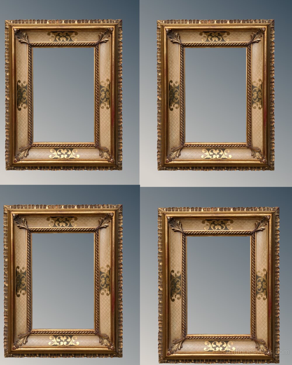 This is a good quality decorative set of four Italian gilt frames in excellent original condition with a deep cushion design and attractive painted and gilded mouldings.