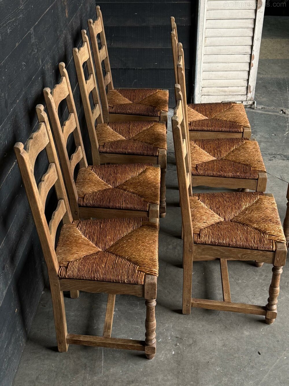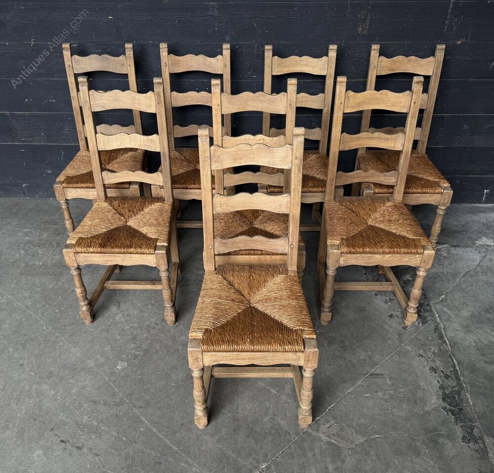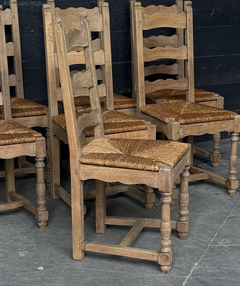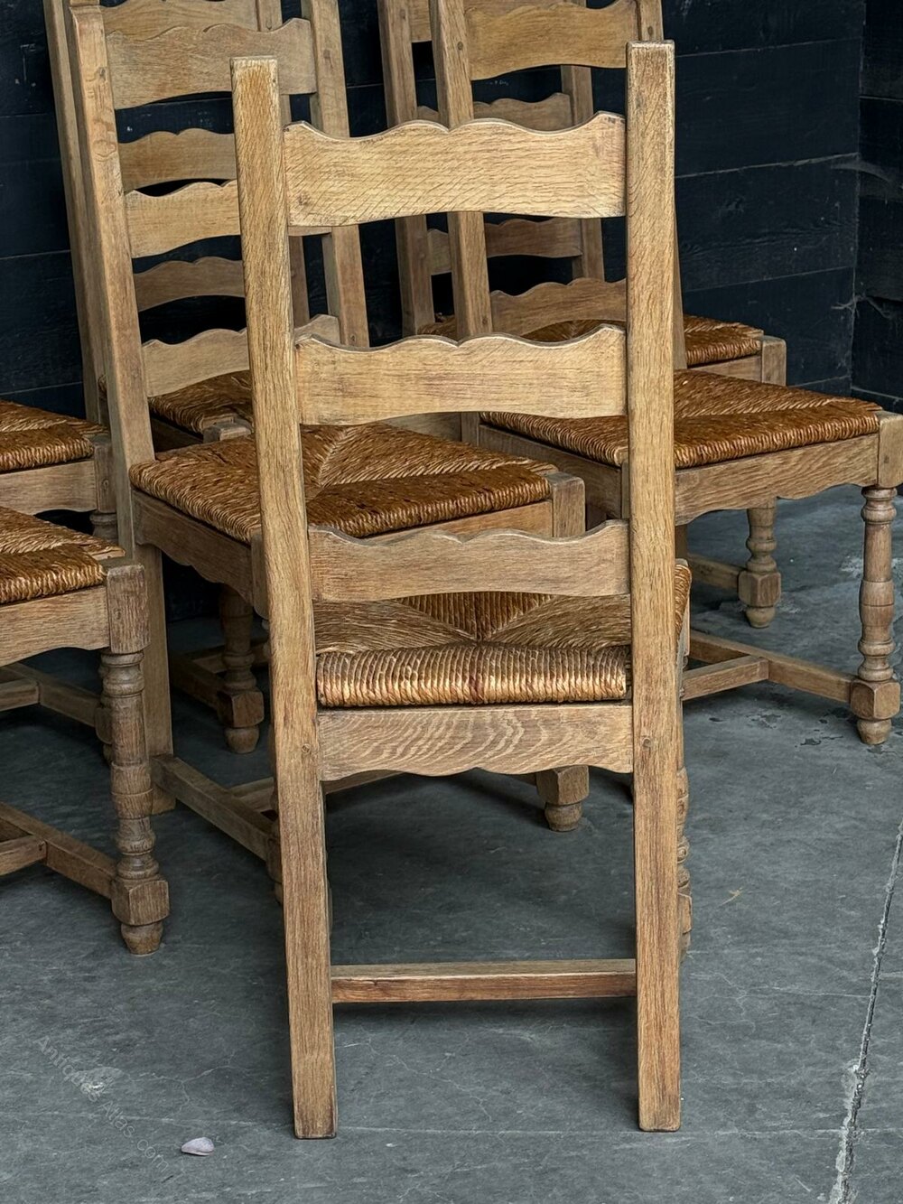 A nice set of French Oak Farmhouse Dining Chairs with rush seats. All are strong and sturdy. We have bleached them for a lighter look and in overall excellent condition for the home.