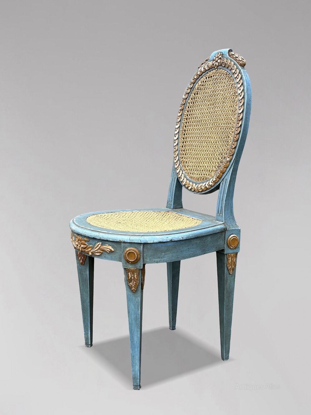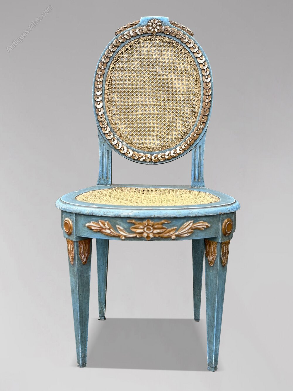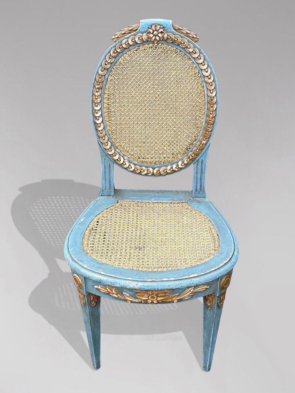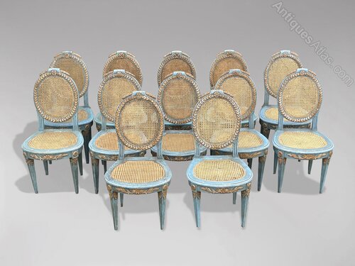 A very elegant set of twelve painted and caned dining chairs in the Louis XVI taste, retaining their original blue paint. The chairs are carved and painted wood, with caning to the backs and seats. Each has a carved bow on the seat back, with rosettes to the tops of the legs and the centre of the seat. They have an exquisite patina with gilded details. The caned backs and seats are painted with a lozenge design, and each chair comes with a squab cushion.