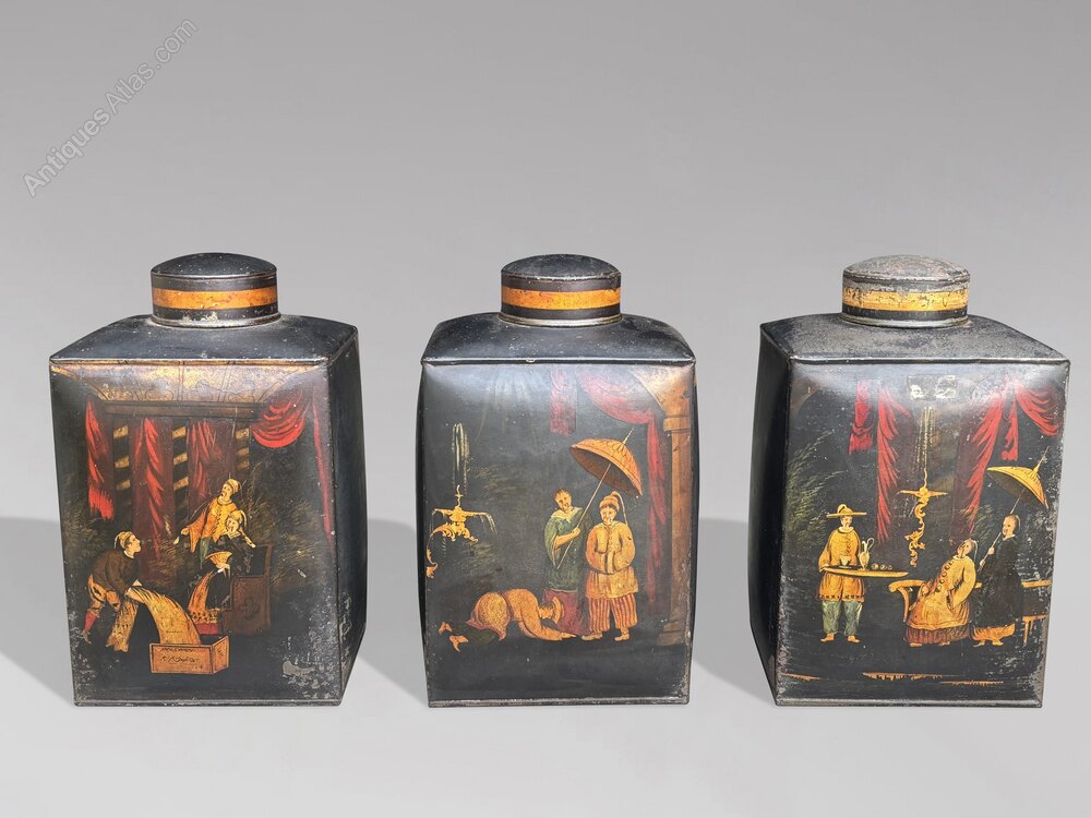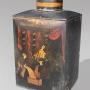 Toleware refers to painted and often japanned metalware, and these canisters are typical of the high quality production associated with Pontypool and the Midlands in the 18th and 19th centuries. The finely painted gilt figures, engaged in trade and domestic scenes, reflect the period fascination with the exoticism of the Far East.