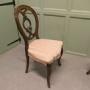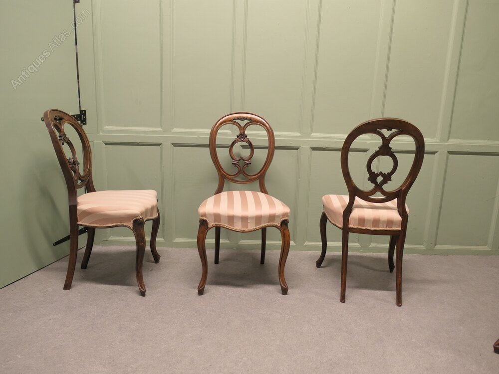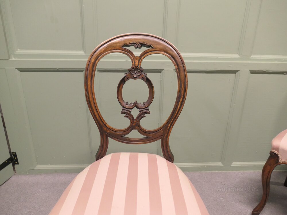 The Chairs have a decorative carved Balloon Style Backs with old regency stripe upholstered seats. The set is sound with no loose joints or wobbles, a very attractive set