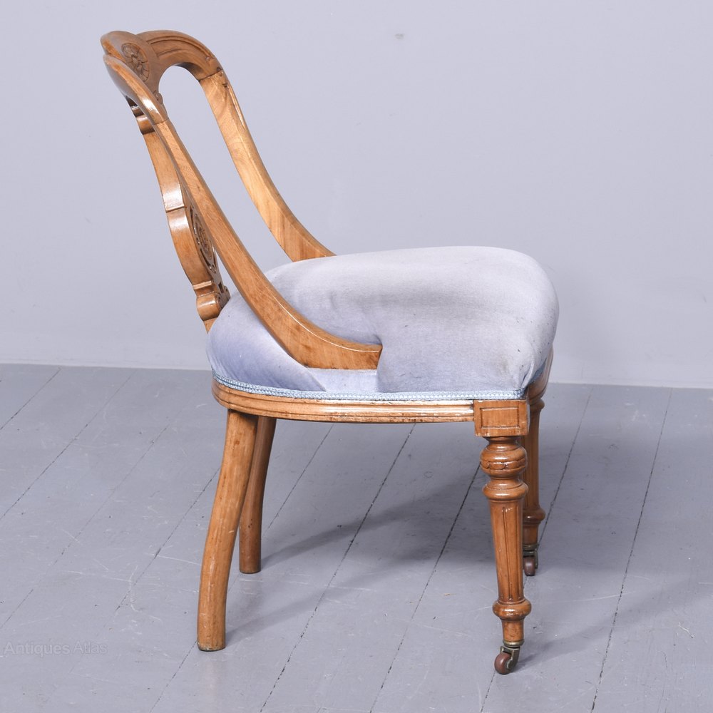 Circa 1880. A set of five late Victorian mahogany carved spoon back dining chairs. The raised top with a carved oval patrae, a pierced and carved splat and two shaped uprights, with a stuff over upholstered seat, reeded seat rail, back legs turned and slightly put swept, front legs turned, ring turned and tapering, finishing on a brown porcelain castor.