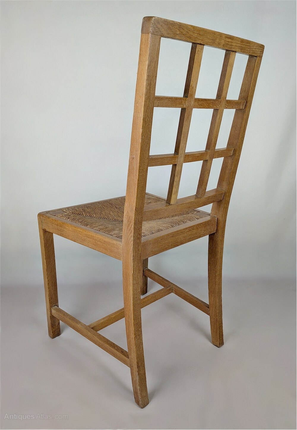 Good set of 6 oak , lattice back dining chairs by Heals , including the hard to find armchairs . Both the frames and the drop in rush seats are in very good original condition , the frames having been cleaned and waxed . Features also doweled joints .