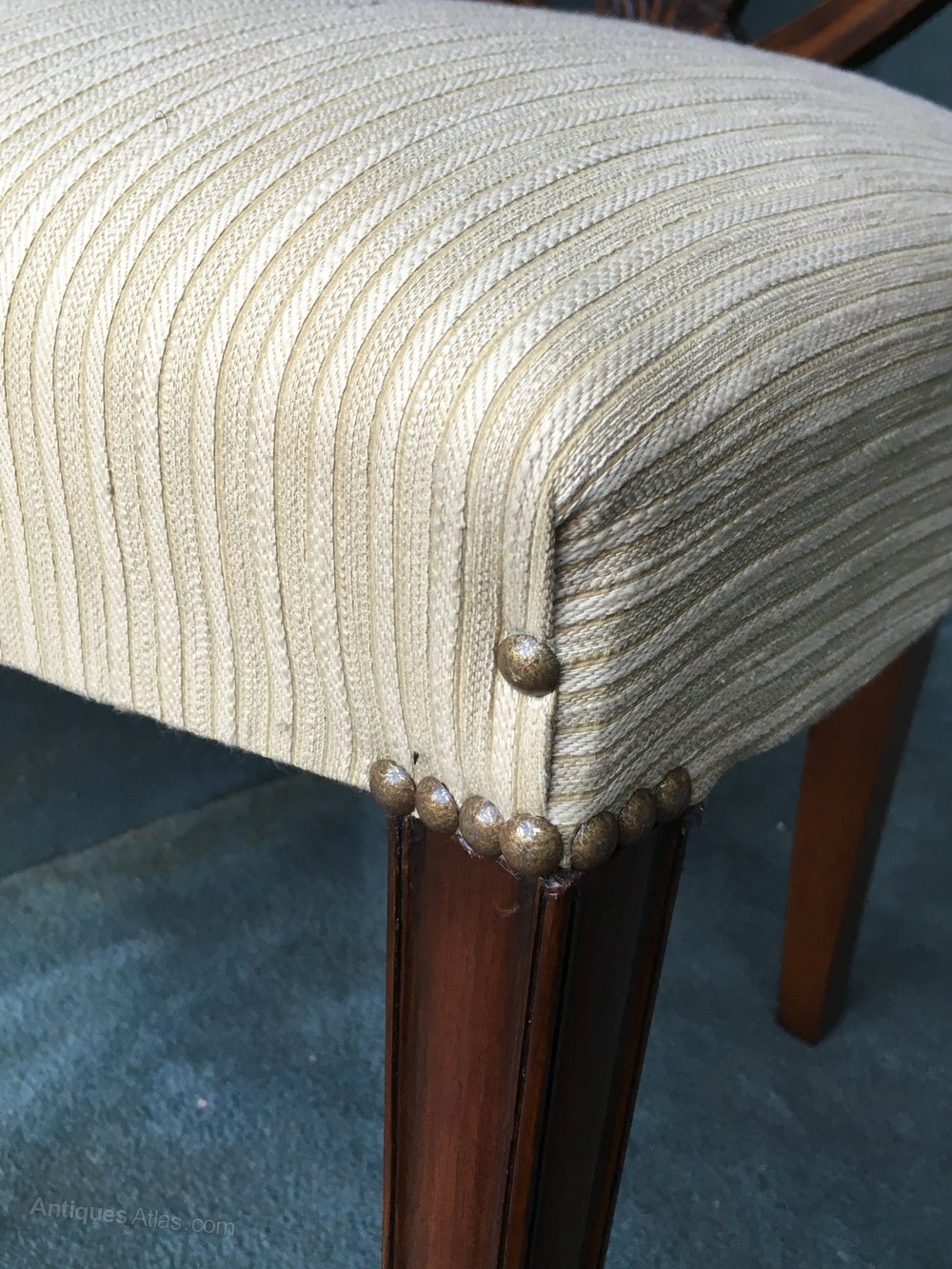 6 + 2 mahogany Hepplewhite style shield back dining chairs with a wheatear carving in the back. The square section front legs terminate with spade feet and the armchairs have a small carved rosette just below the arms. The seats and have all been traditionally reupholstered using horse hair. Circa 1900