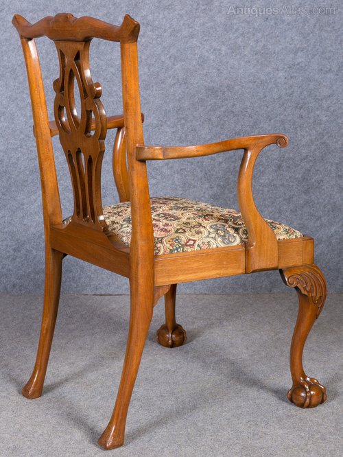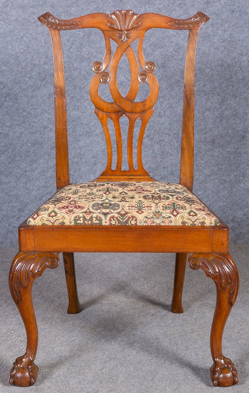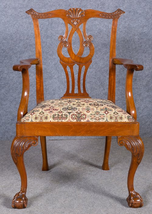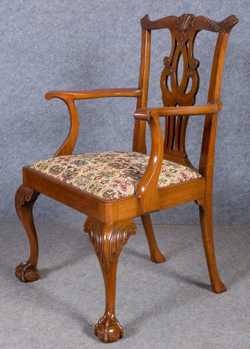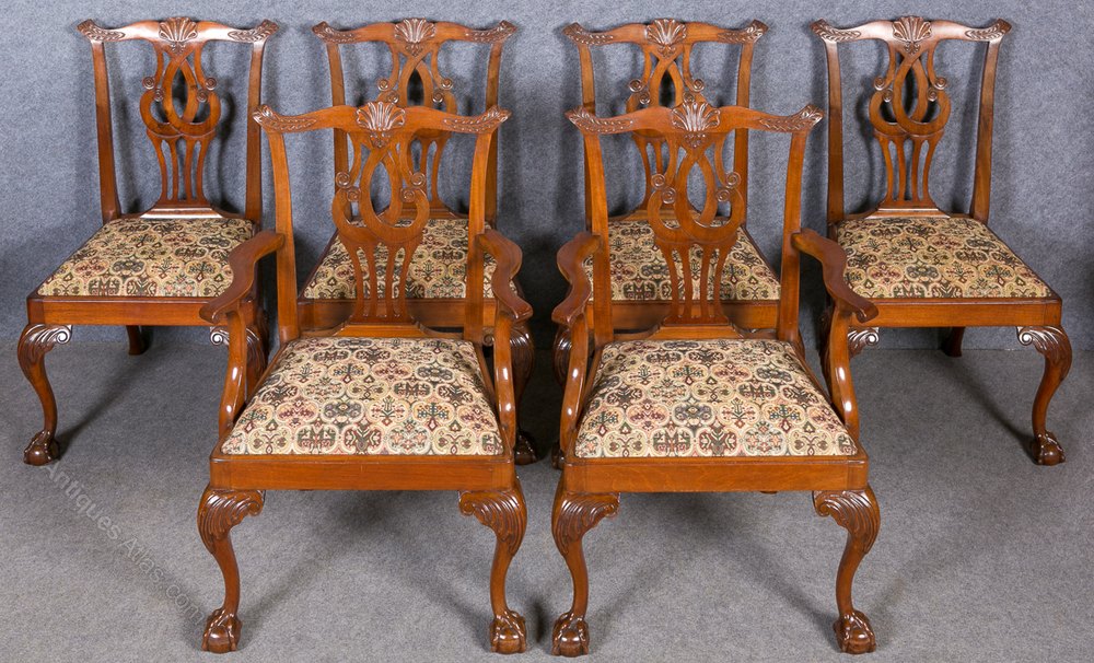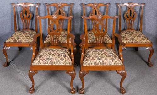 A good quality set of mahogany Chippendale style dining chairs consisting of 4 side and 2 carver chairs all with drop in seats. The backs of typical Chippendale design with carved shell and acanthus decoration with open carved shaped splat. The front legs with claw and ball feet and acanthus carved knees. All in very good original condition, fully cleaned and waxed. Sizes- Side Chair Height...37''/ 94cm. Carver Height...37.75''/ 96cm. Width...22.5''/57.5cm. Depth...21.5''/ 54.5cm. Delivery to most of U.K. mainland £75.