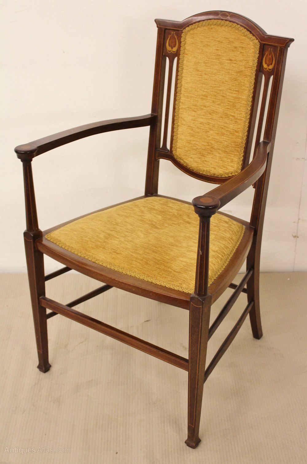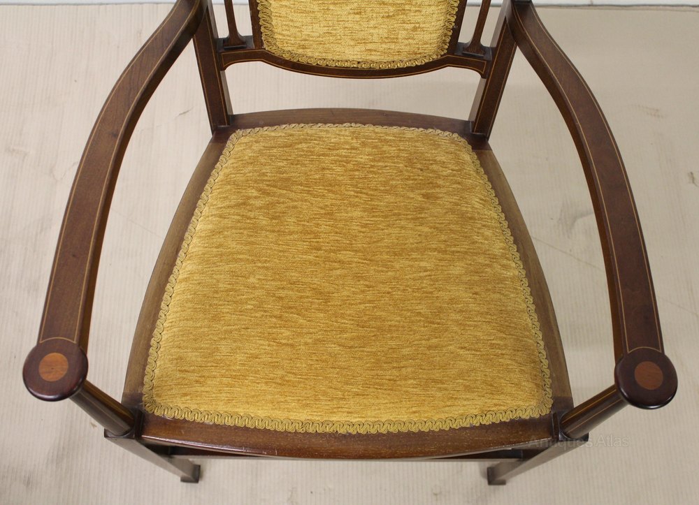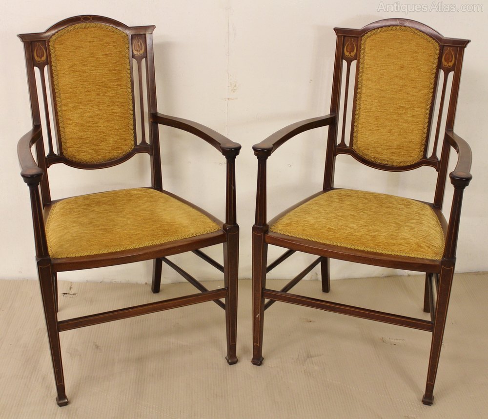 A stylish set of 6 inlaid mahogany chairs the Art Nouveau period. Well made in solid mahogany and decorated throughout with stringing inlay. The chair backs are decorated with stylised floral motifs redolent of the period. The suite consists of a pair of armchairs and four matching side chairs. They are offered for sale in excellent original condition with a good colour and patina. The upholstery is in very good order and the chairs are all free from any wobbles.