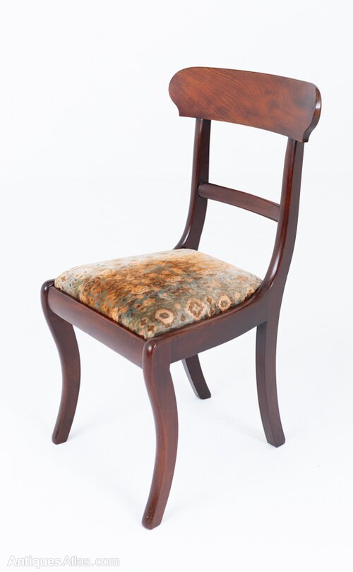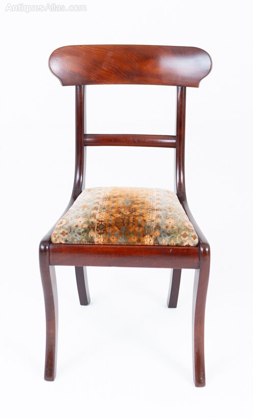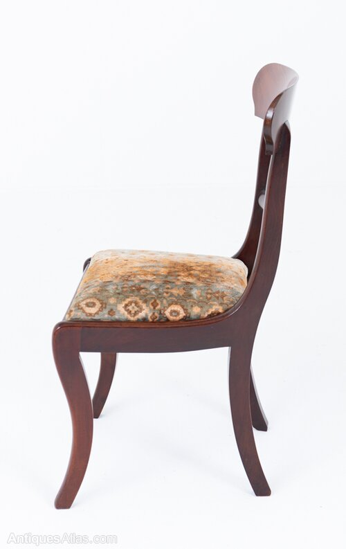 A fine set of six mahogany Regency dining chairs, raised upon elegant sabre legs.