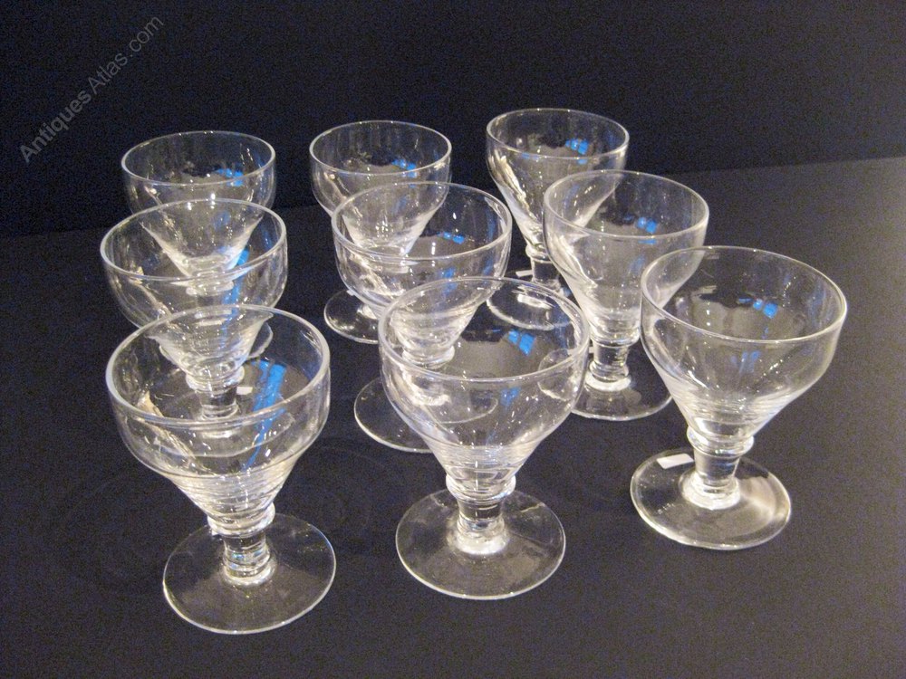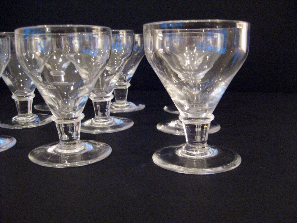 Circa 1900/10. No chips to any of these glasses however two have a slight bloom to the base of the bowl(common to old glass) but nothing to detract from a great set that are perfect to use.