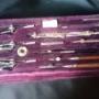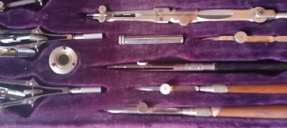 .Here is a Good Set of Architecs/Surveyors/Planners Drawing Instrumens. Set in a Purple Case an possibly from the 1930's. The case is Complete and Measures 27cm in Length and 14 in Width.