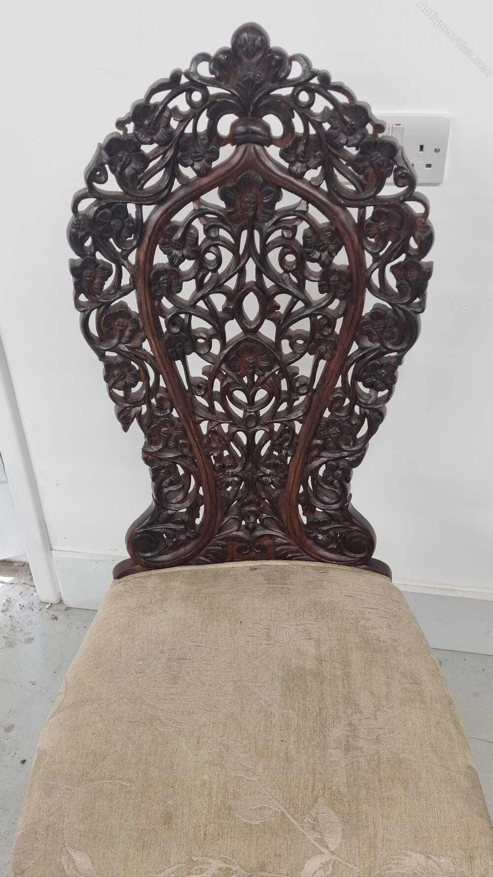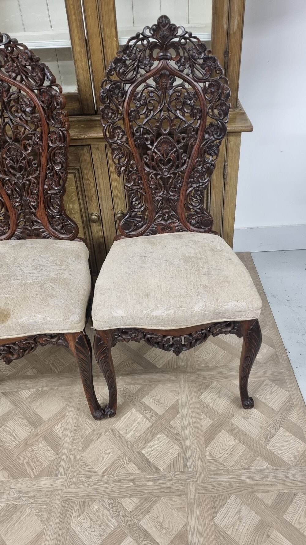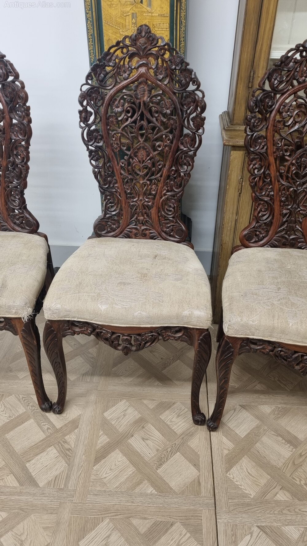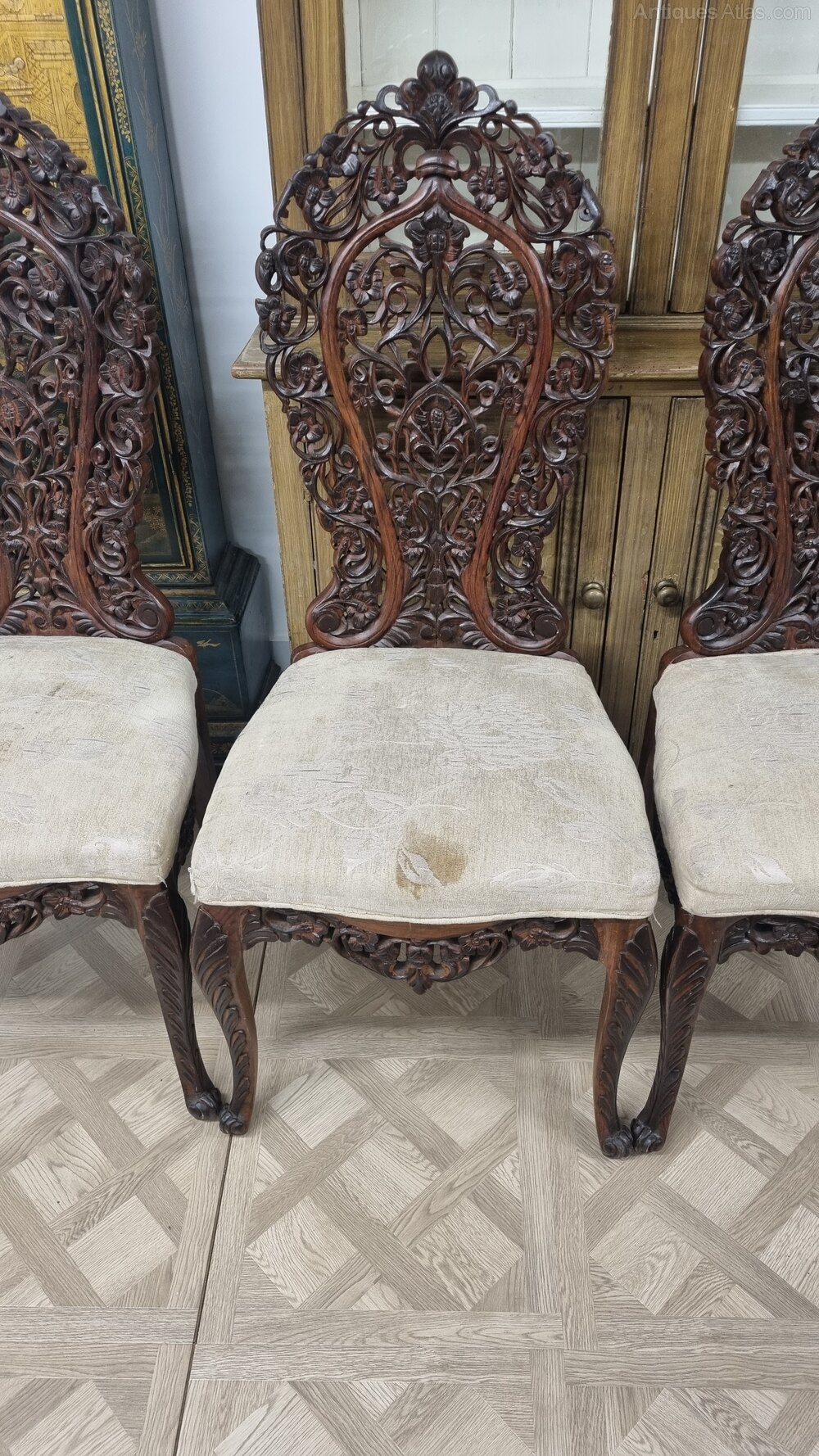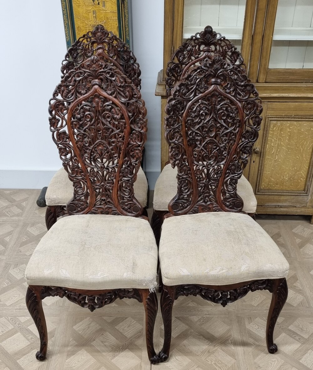 A striking set of four Anglo-Indian chairs, beautifully hand-carved in solid rosewood, dating from the late 19th to early 20th century. Each chair features intricately pierced backrests with flowing foliate and scroll motifs, showcasing the exceptional craftsmanship typical of Anglo-Indian furniture of this period.