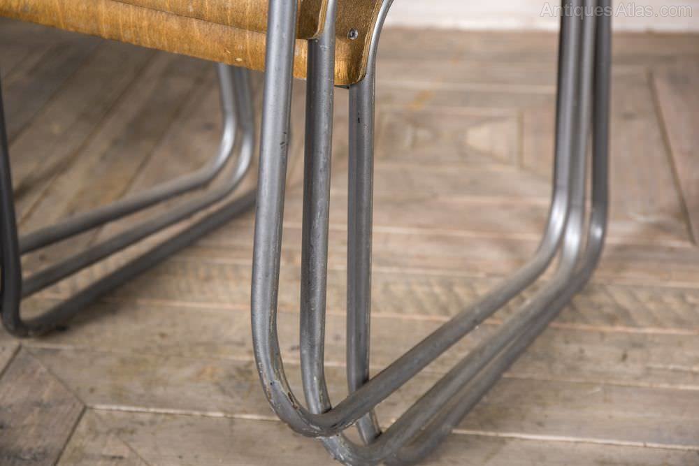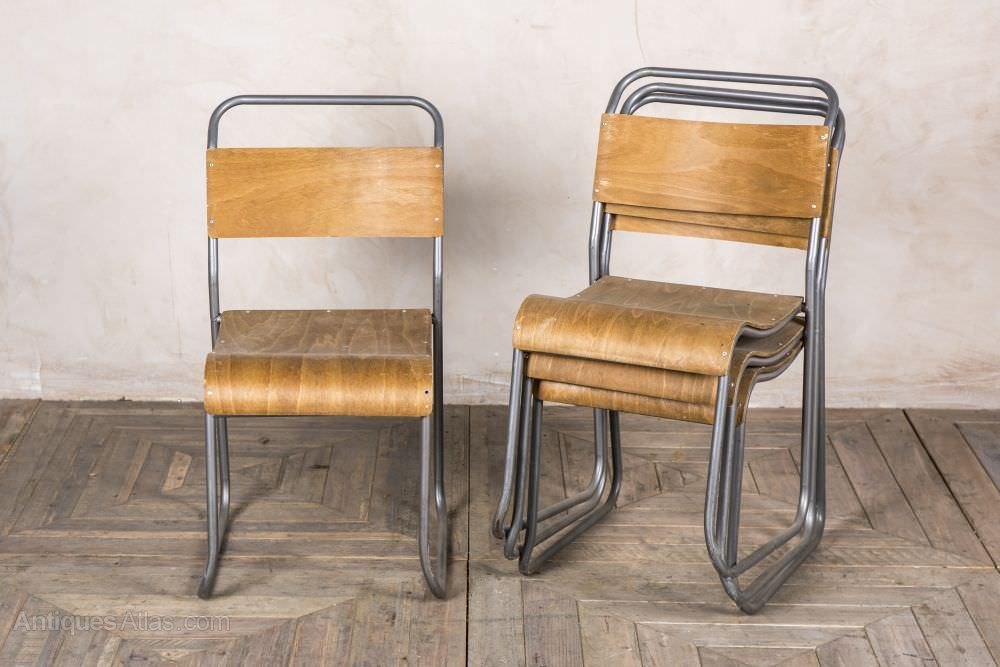 These sturdy stacking chairs are original vintage items that would have previously been used in a school. They feature hooked metal frames and steam-bent seats and back rests.