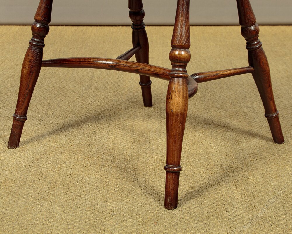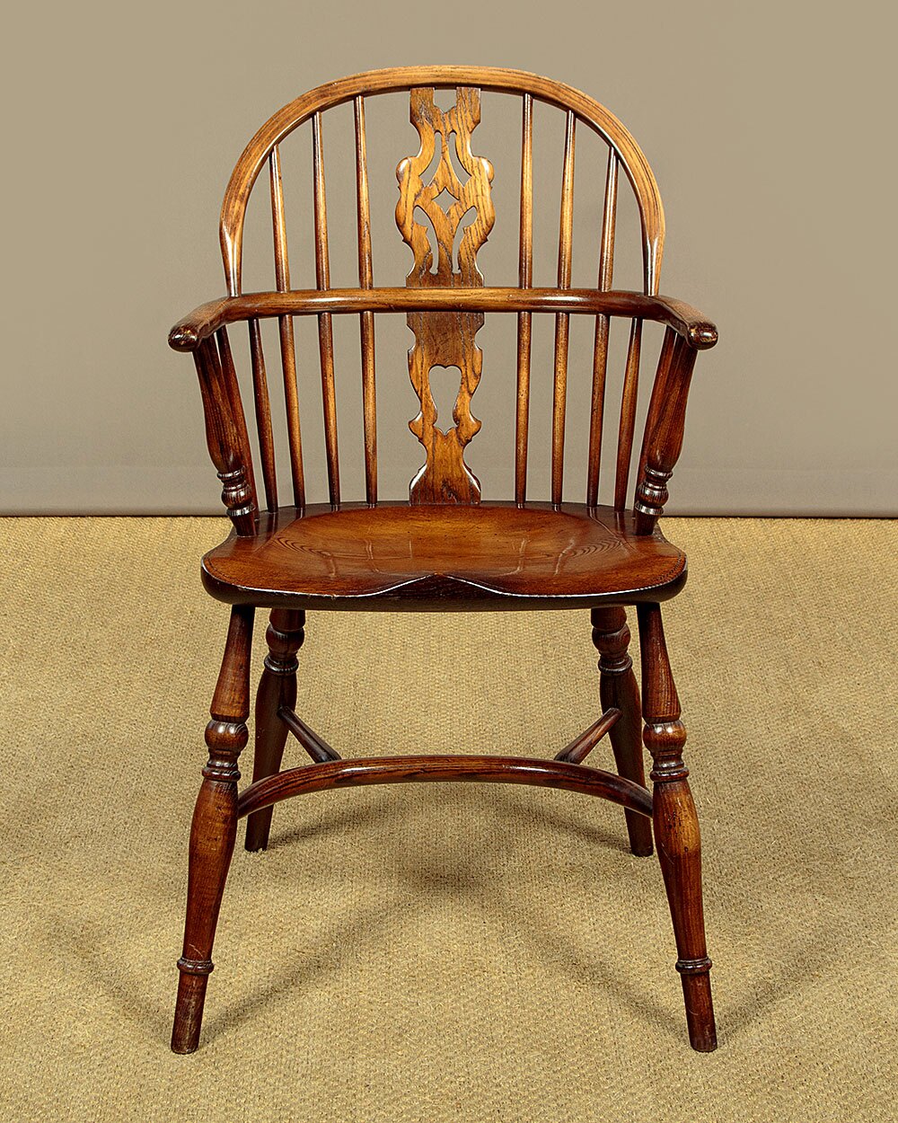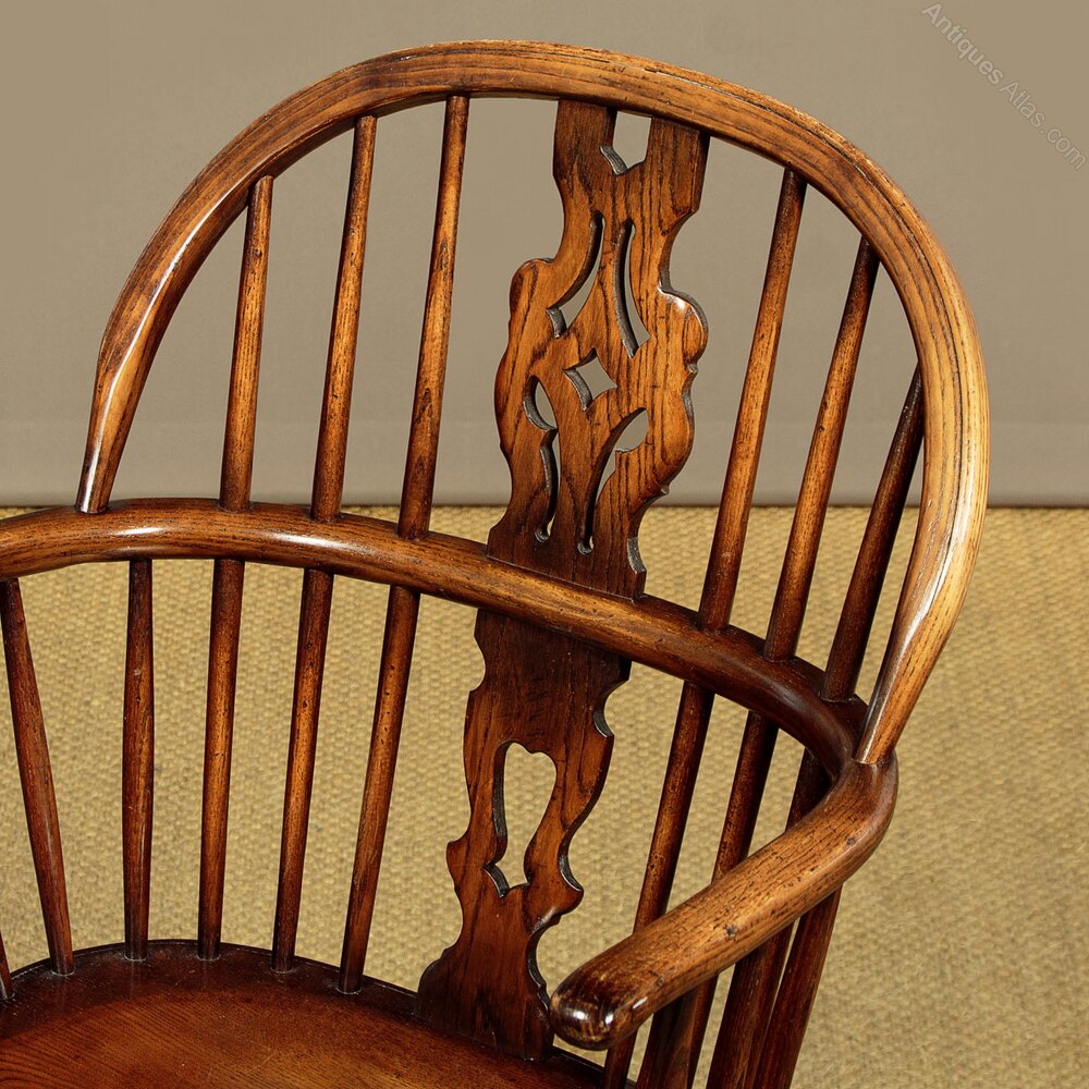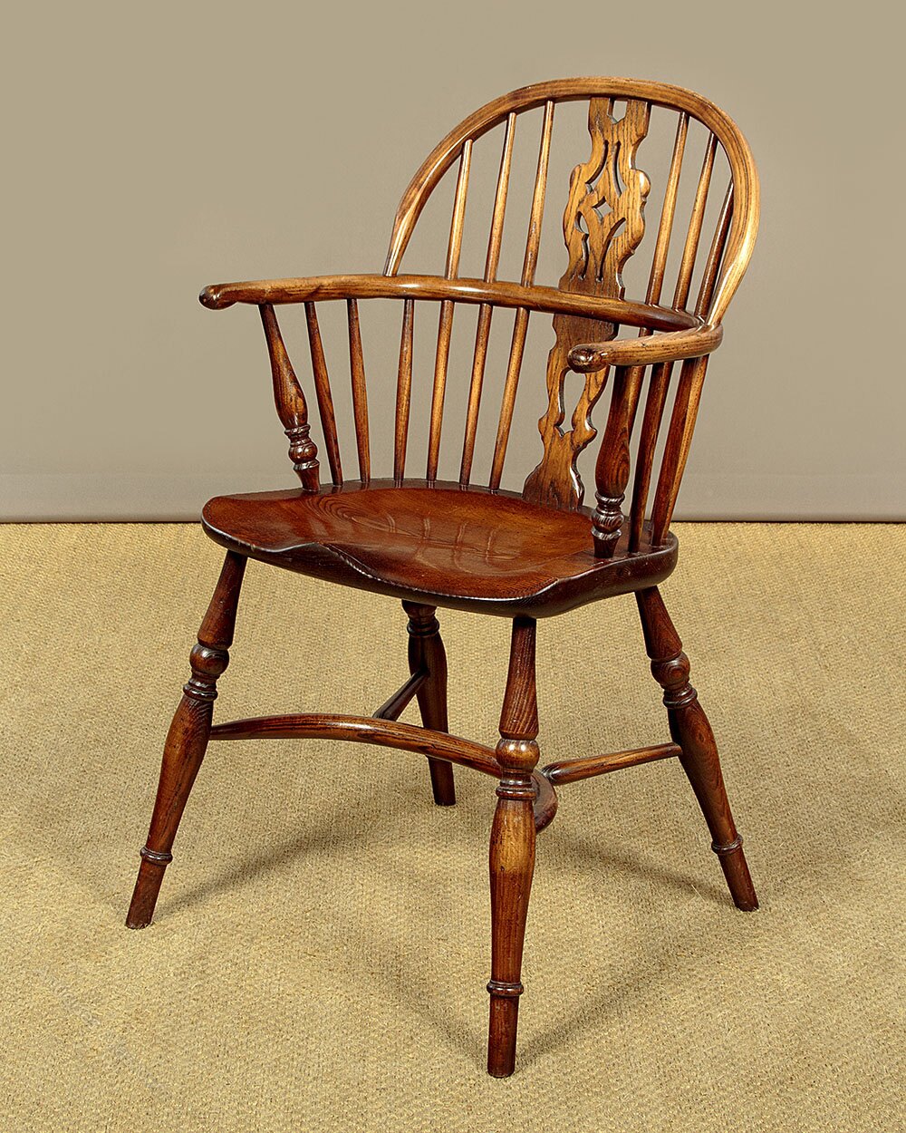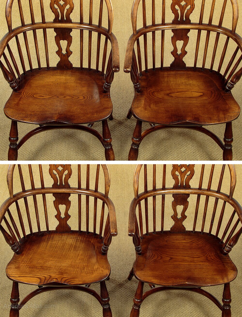 Good quality set of four Windsor armchairs in ash. Steamed top rail and arms joined with shaped and pierced back splats and slim spindles. Shaped detail to the arm terminals, raised on turned supports. Over single piece shaped 'saddle' seats (height 18"). On turned legs, splayed for stability and joined with curving crinoline stretchers. Very good colour and condition.