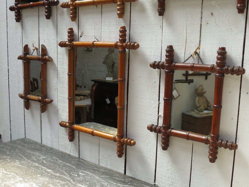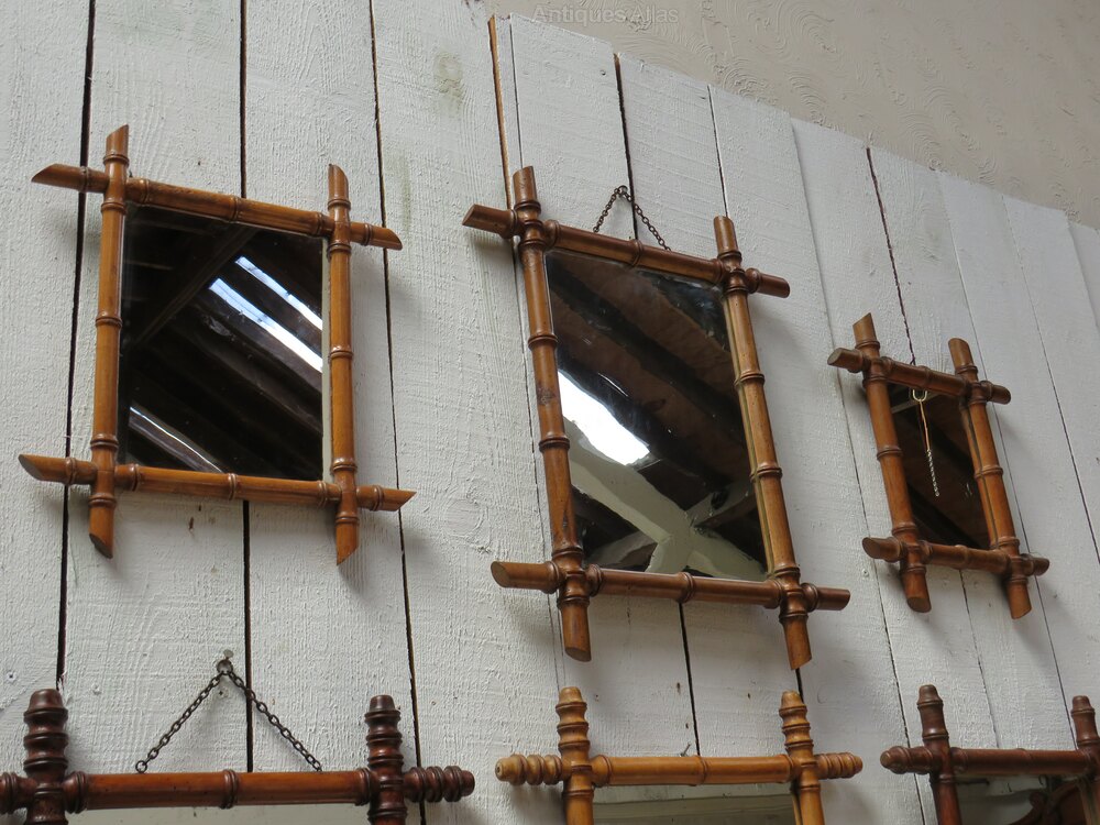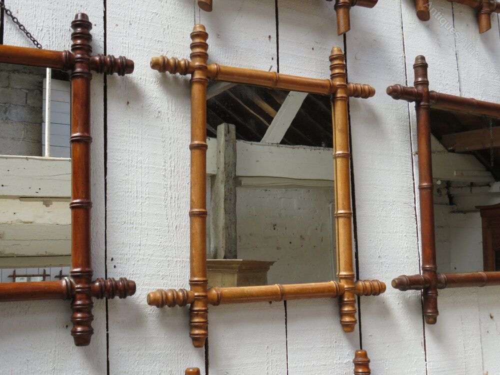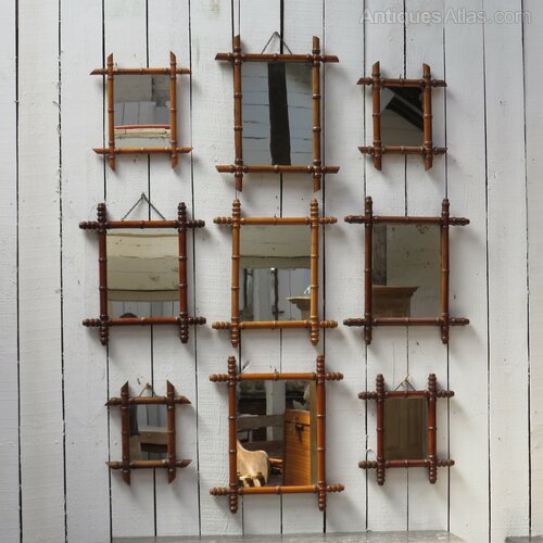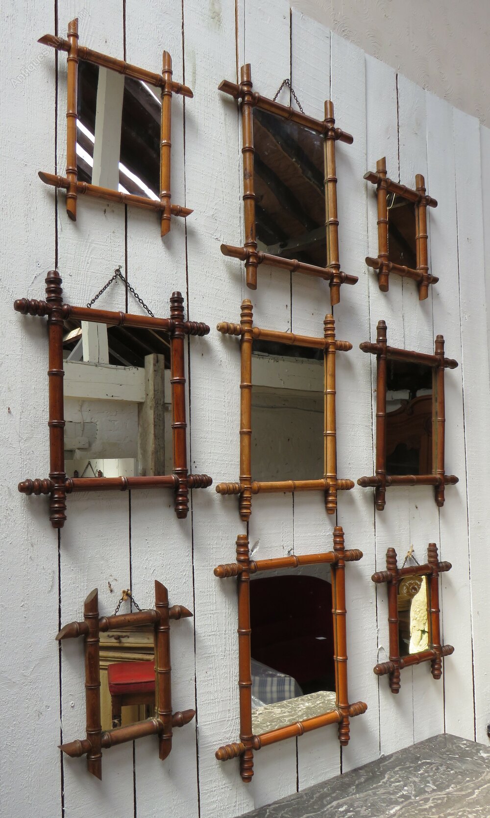 Set of nine late 19th century, early 20th century French decorative faux bamboo wall mirrors with foxing to the glass plates ready to hang.