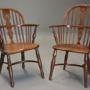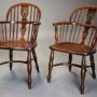 The arms being supported by turned arm supports leading down to shaped elm seats supported by four turned legs joined with a crinoline stretcher.