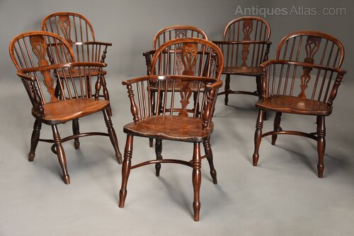 A very well matched set of six mid 19th century (circa 1840) yew wood low back Windsor armchairs, five of the chairs matching with one very similar additional chair all of superb patina from the Rockley area of Nottinghamshire.