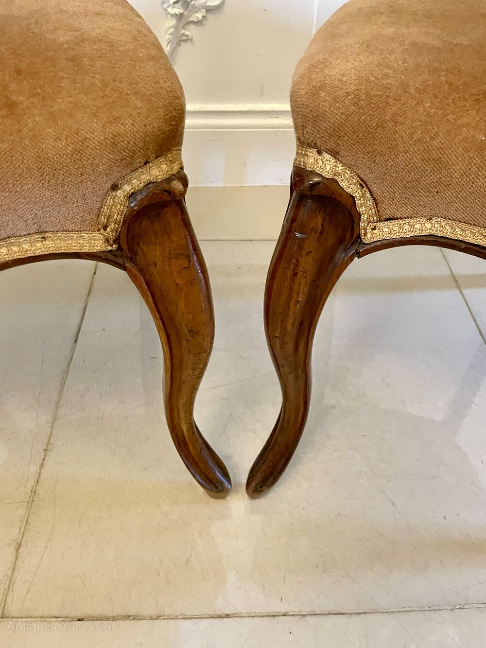 The serpentine-fronted seats are traditionally upholstered in a warm-toned fabric standing on cabriole front legs and swept back supports. The walnut frames display a rich colour and pleasing patina developed over time.