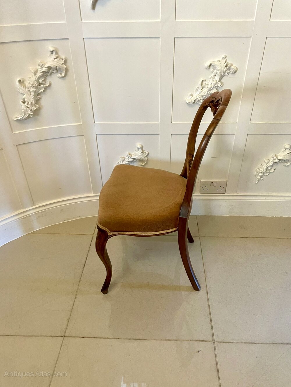 A fine quality set of six mid-19th century Victorian dining chairs beautifully crafted in solid walnut with elegant balloon-shaped backs. Each chair features a shaped and carved top rail with foliate scroll detail and a pierced central splat, typical of the period’s refined craftsmanship.
