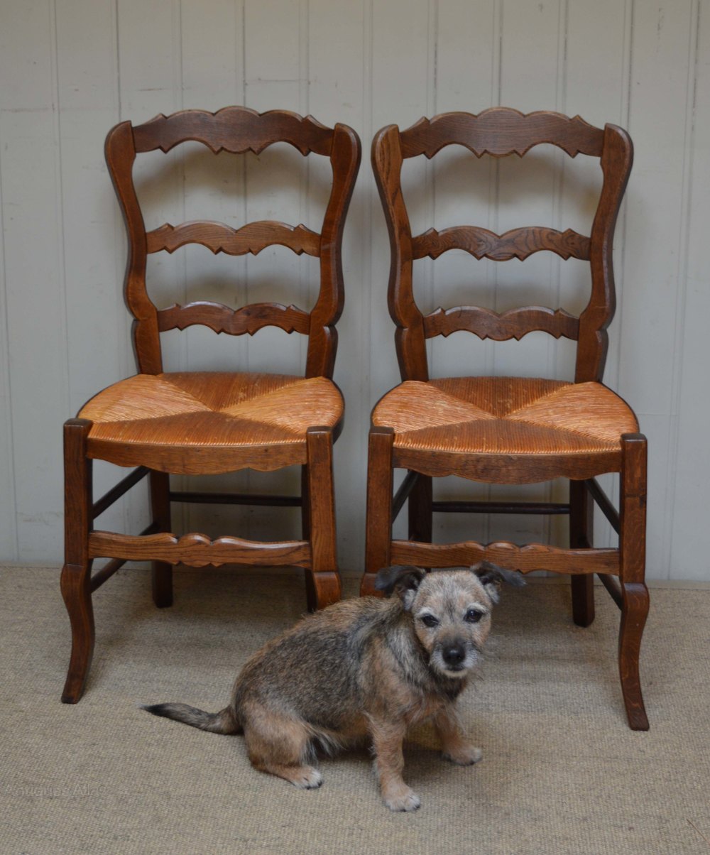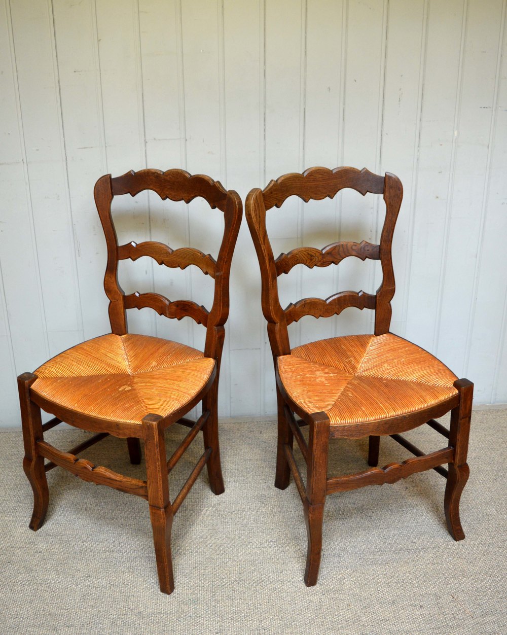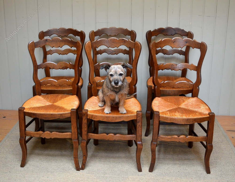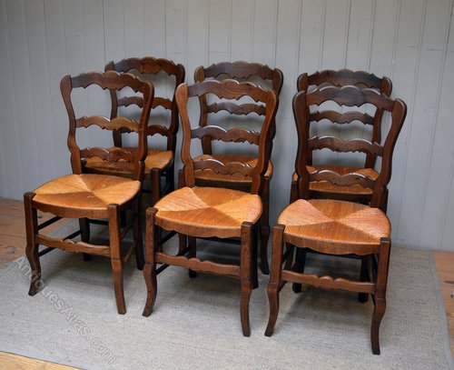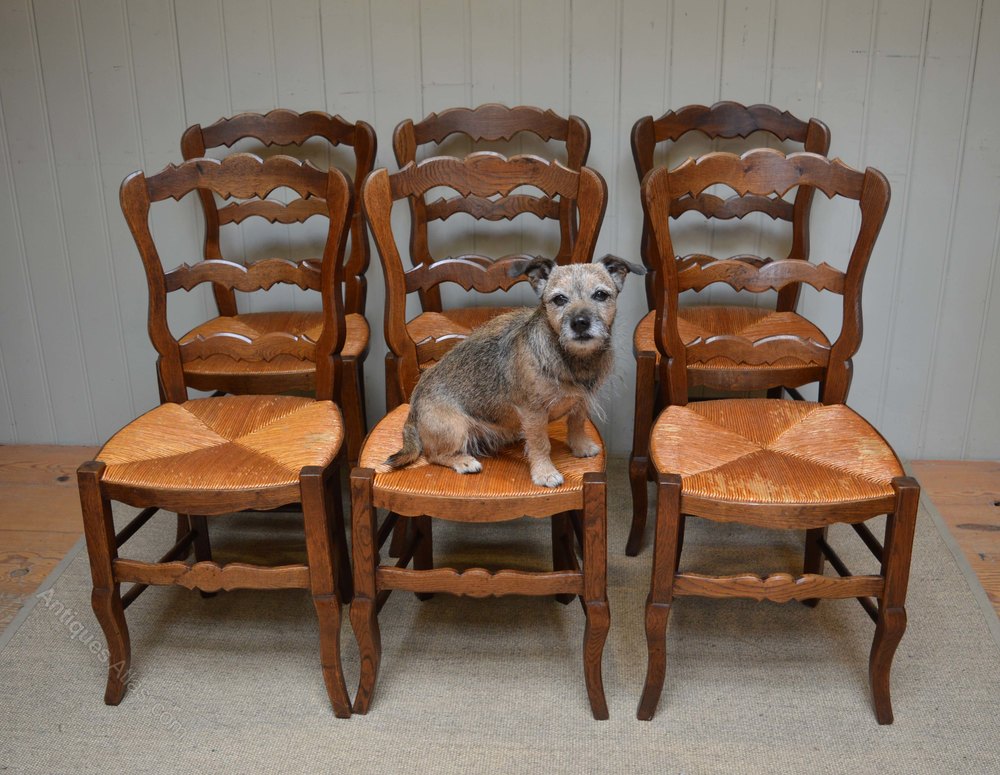 Set of six beech rush seat dining chairs having ladder backs and raised on cabriole legs
