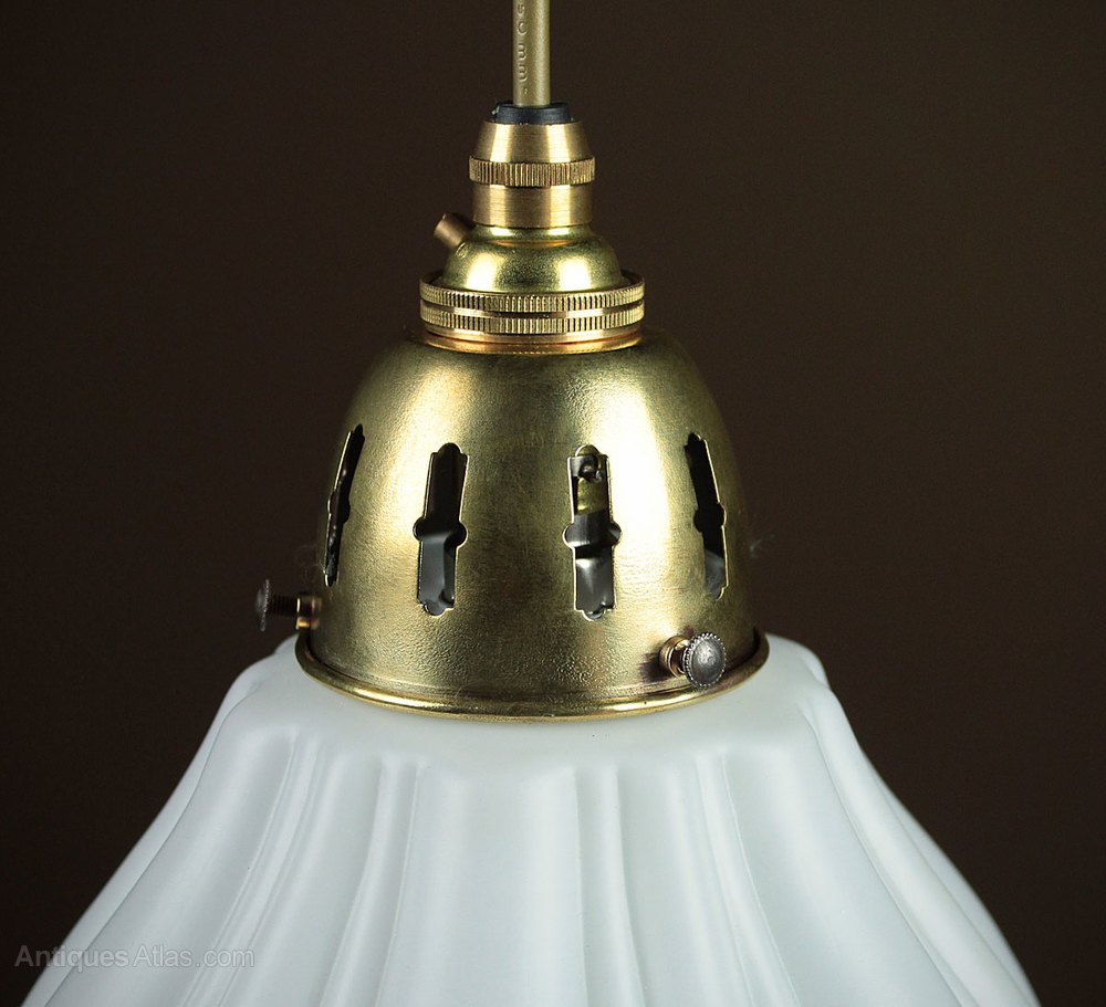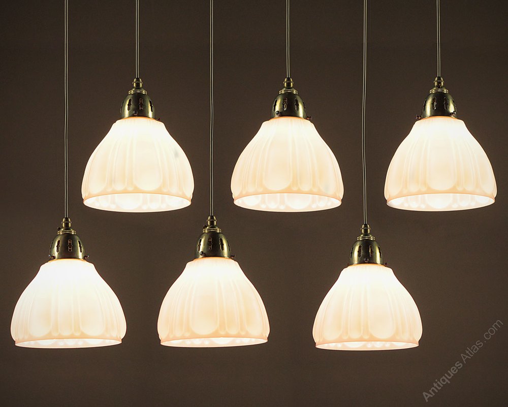 Superb run of six early 20th.c. hanging chapel lights c.1920. Attractively shaped 8″ diameter opaque white glass shades hung from the original pierced brass tops. Excellent condition, cleaned and rewired with new brass bulb holders.