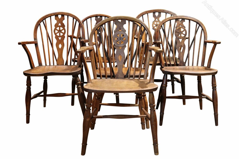 Each chair features the classic wheelback splat, framed by elegant turned spindles and a shaped central splat incorporating the distinctive wheel motif. The backs are gracefully bowed, providing both comfort and visual balance, while the gently curved arms are supported by shaped arm supports.