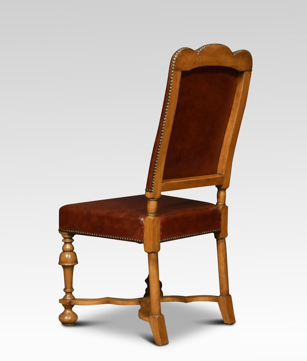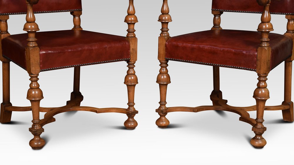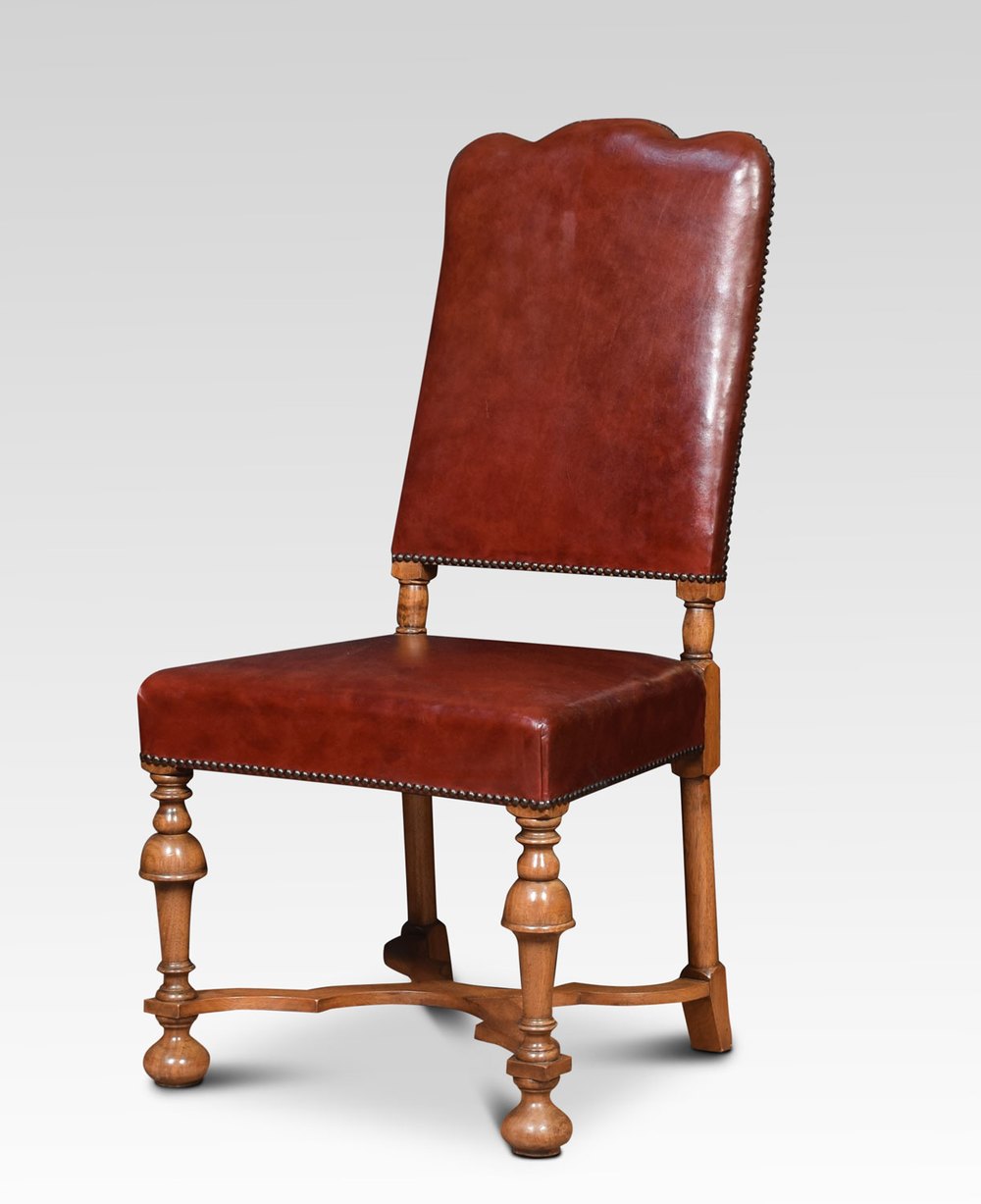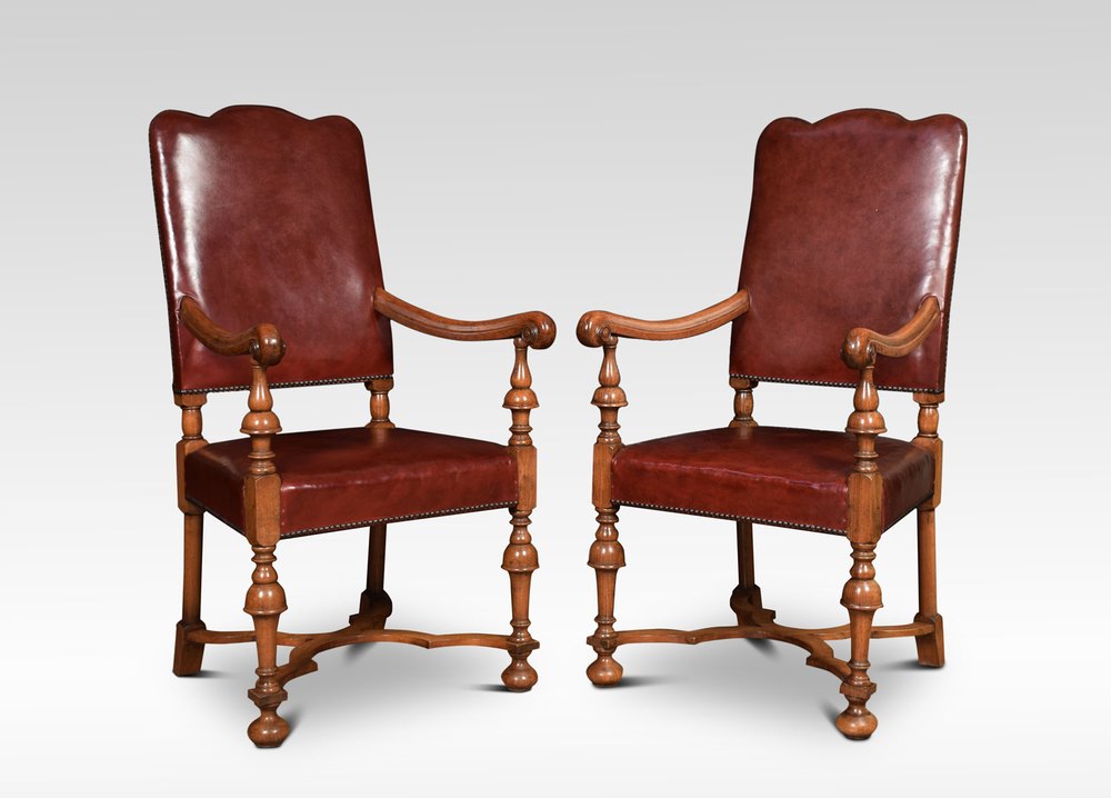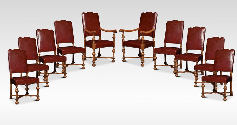 Set of ten dining chair comprising of two carver armchairs and eight chairs, all having large rectangular burgundy leather backs and overstuffed seats with close nail border. The carvers having scrolling arms. All raised up on turned front legs united by cross stretchers.