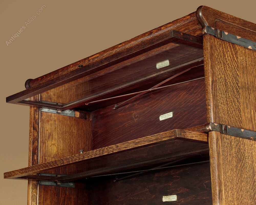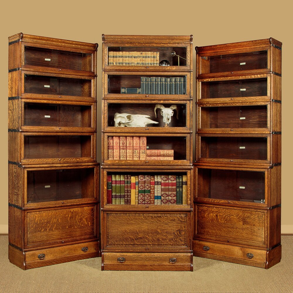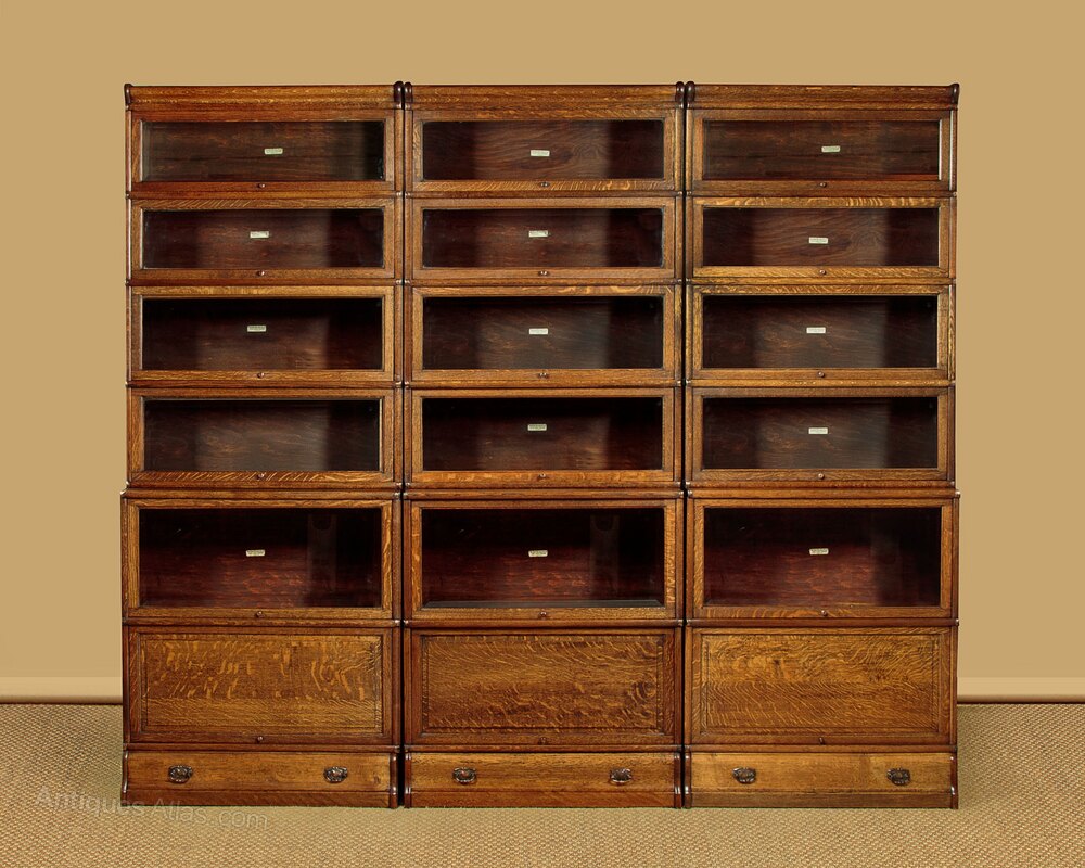 Rare set of three matching stacking oak bookcases by The Globe Wernicke Co. c.1910. Standing 87" tall. Each stack with four shallow glazed bookcase sections (internal depth 9"), over two deeper sections (internal depth 12") one glazed, the other with a blind door. Each section with Wernicke’s patented lift and slide door mechanism. Shaped cornice and plinths, each featuring a useful drawer. Excellent quality with bevelled glass fronts, original brass knobs, solid oak sides and copperized metal bindings. Original Globe-Wernicke labels. Excellent condition, cleaned and waxed in our workshops.