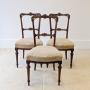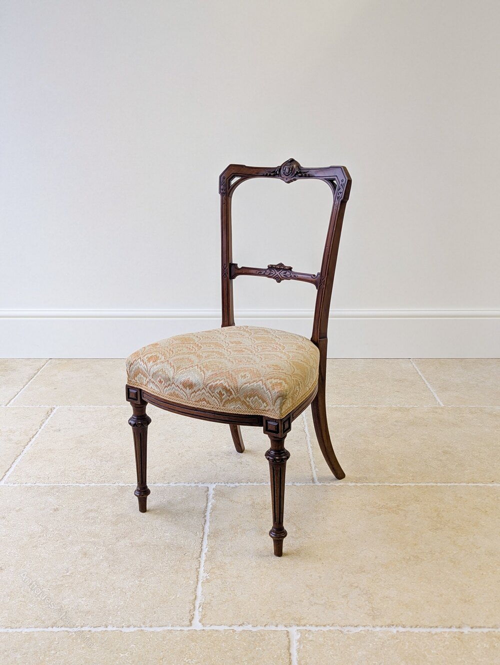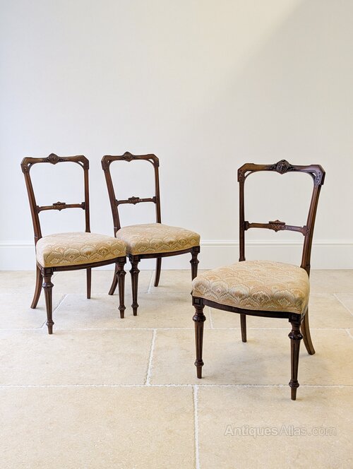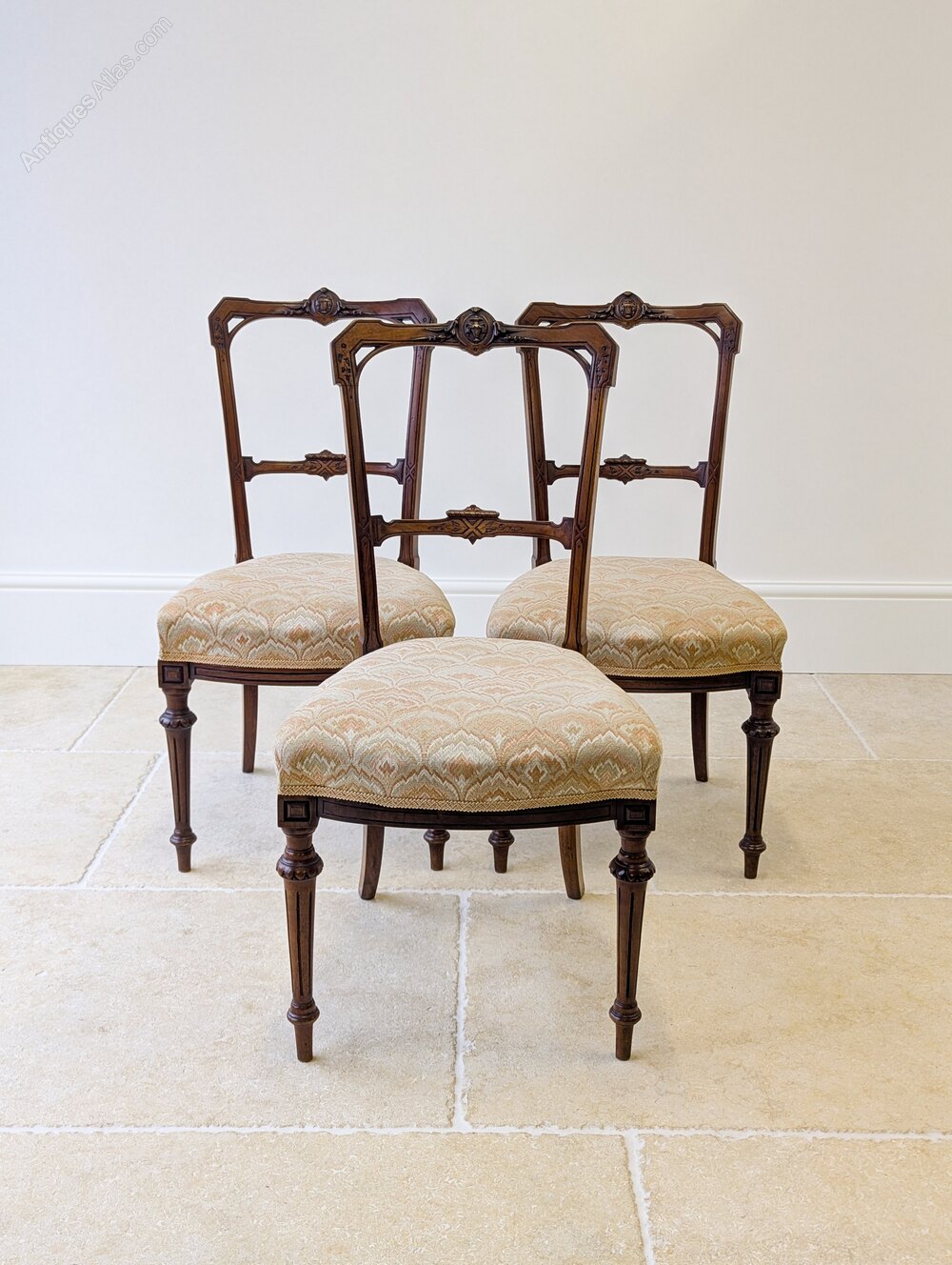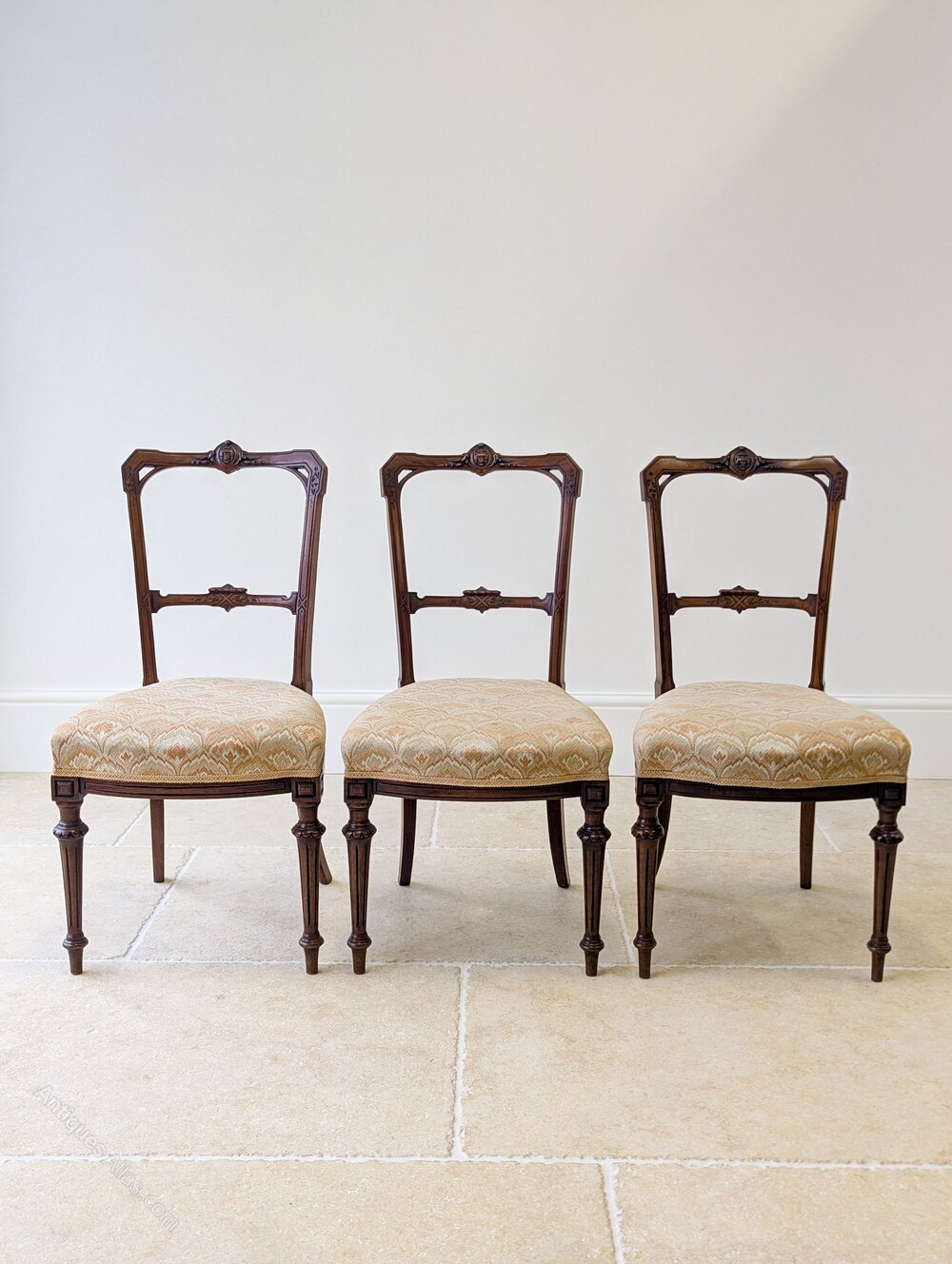 An attractive set of three late Victorian mahogany side chairs in the Aesthetic Movement taste. The shaped backs feature a crest rail centred by a carved roundel with a classical urn motif, above a decorative horizontal splat with incised geometric and foliate detail, all over finely upholstered seats raised on turned and reeded legs.