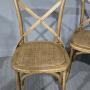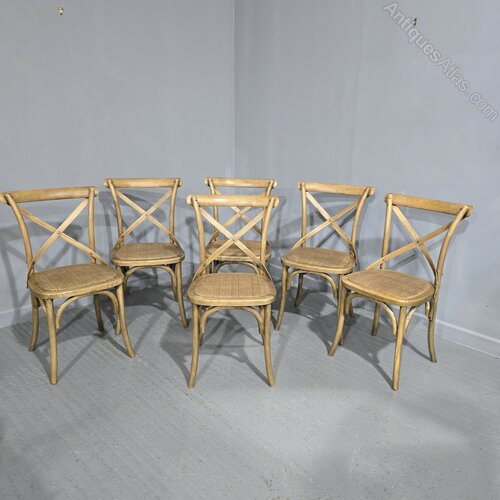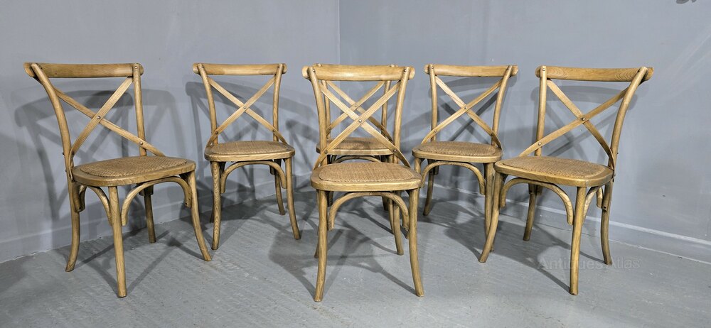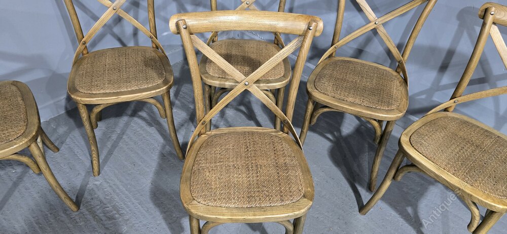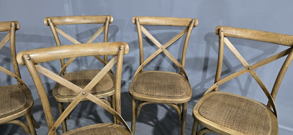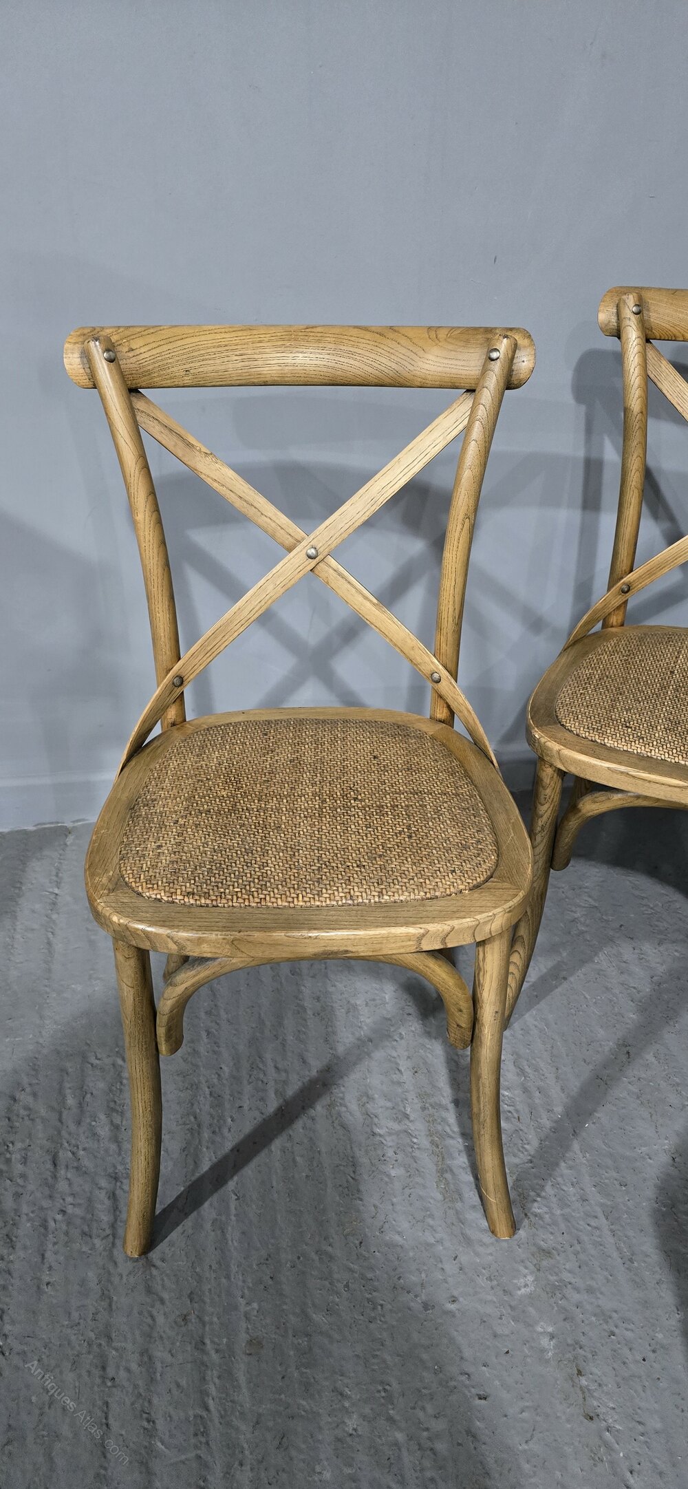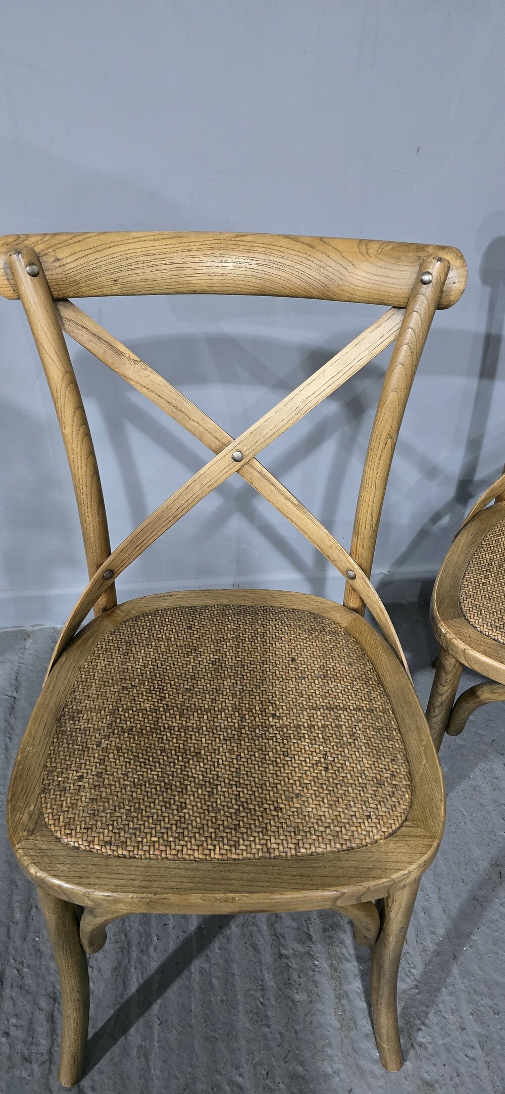 Very good set of oak bentwood kitchen dining chairs, rafia seats, X frame back, in excellent overall condition.
