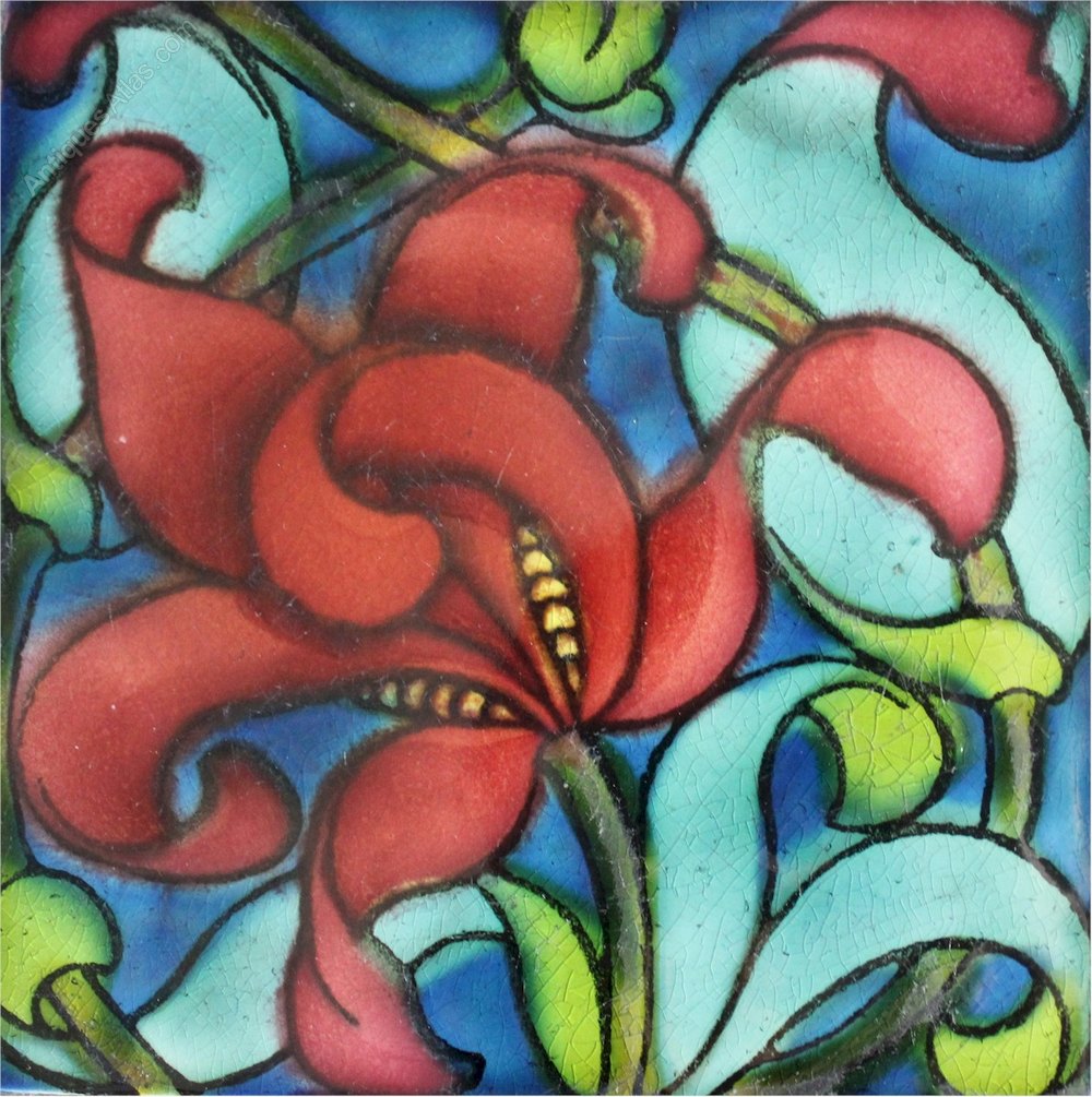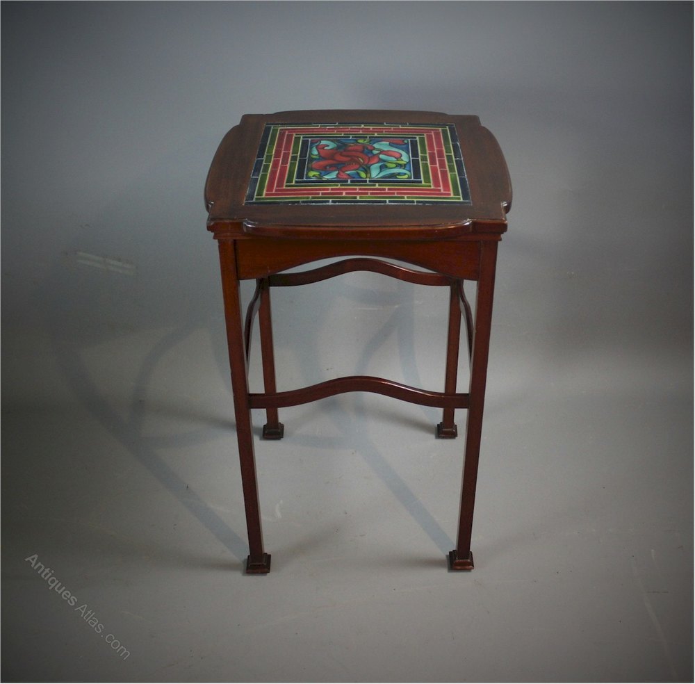 Shapland and Petter tiled side table in mahogany with a wonderful floral tiled top. wavy side stretchers , square legs with pad feet. Registered number to base. Measures 67.5 cm high x 44 cm sq