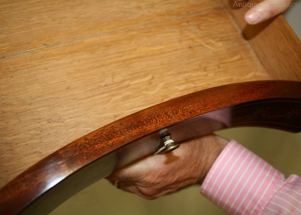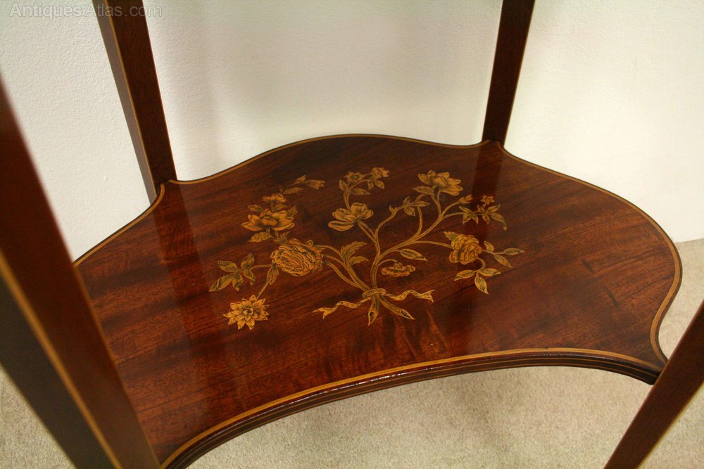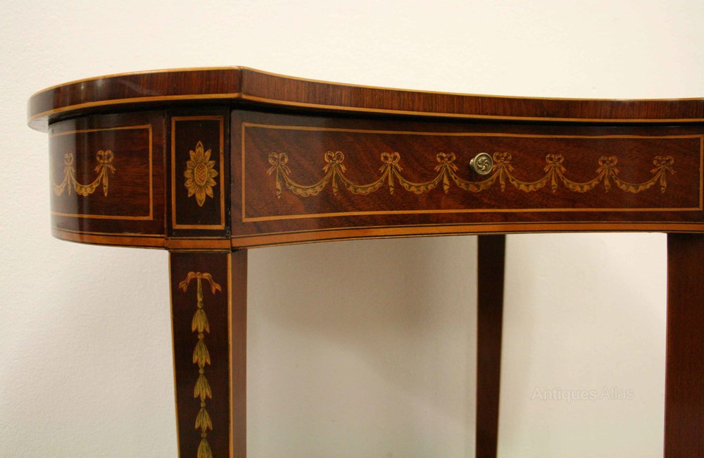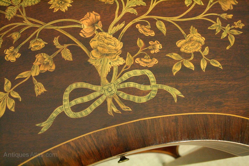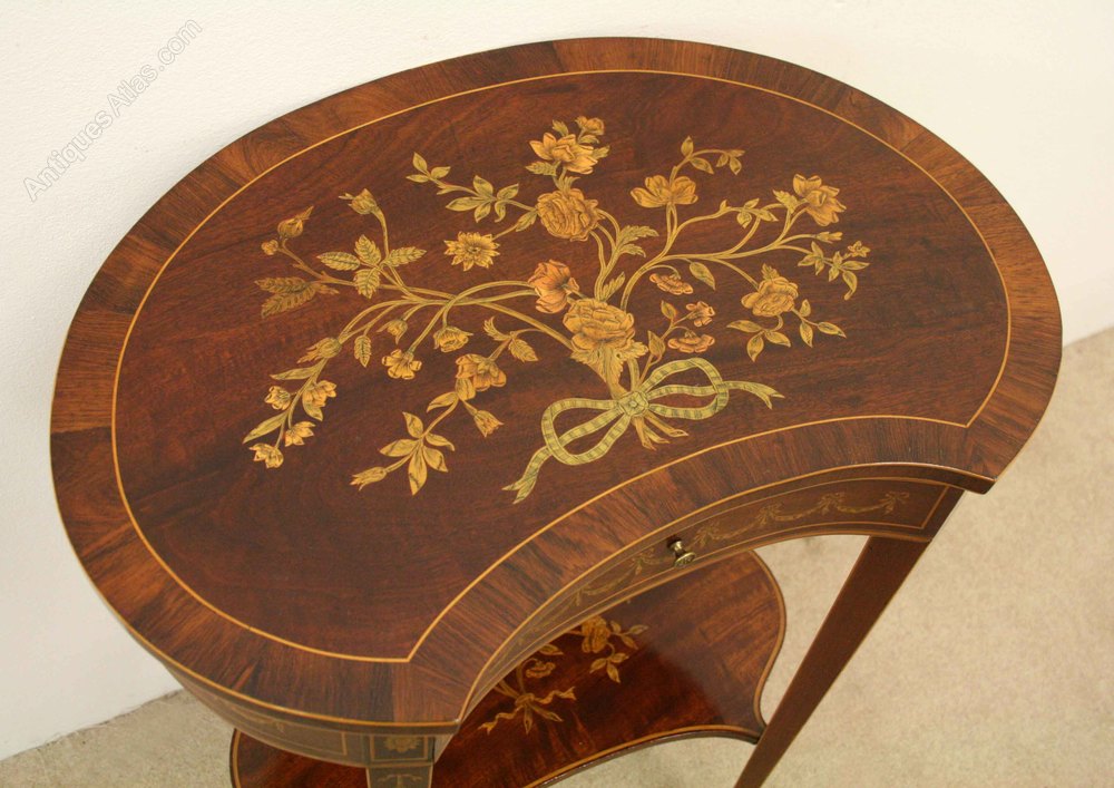 Circa 1900, finest quality kidney shaped Sheraton style Edwardian occasional table. The rosewood and inlaid cross banded top profusely decorated with a fine floral panel, above a single concave shaped drawer and frieze decorated with fine inlaid garlands, all standing on tapering inlaid supports with a marquetry inlaid shelf beneath. Stamped ‘Edwards & Roberts’ in the drawer.