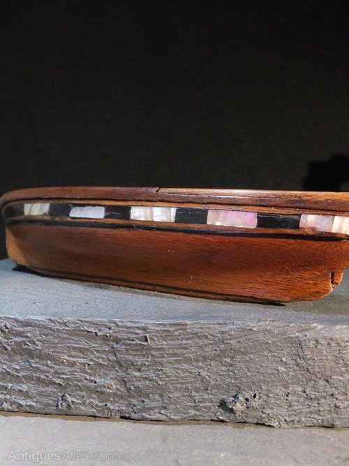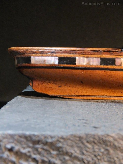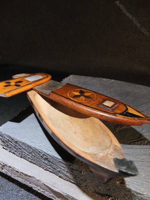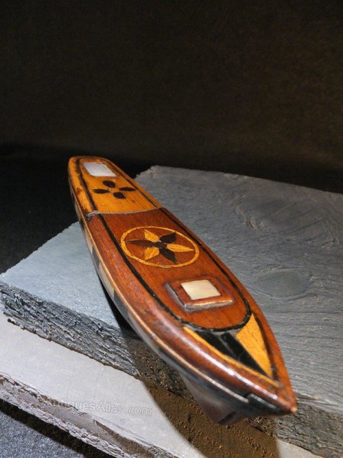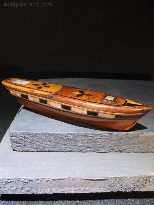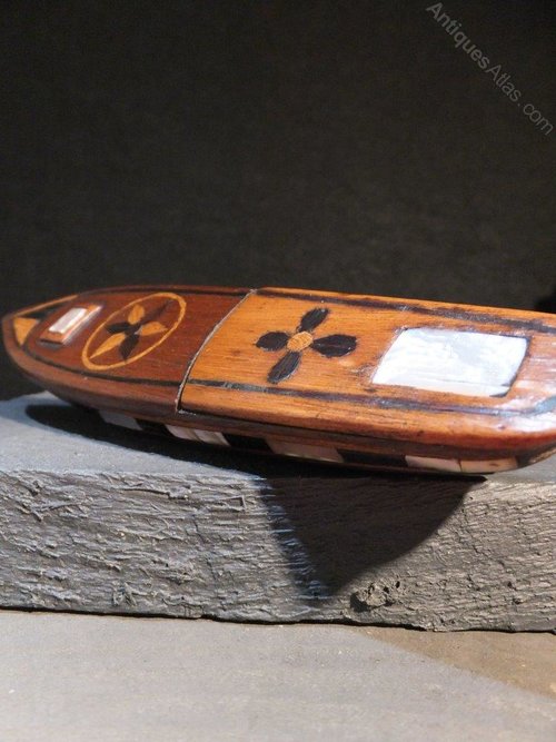 A charming novelty snuffbox with contrasting inlays of mother-of-pearl, ebony, mahogany and fruitwood. The deck unlocks from the hull and rotates to reveal the snuff compartment. Minor loses to the keel. Mid 19th century. 14cm long. £365