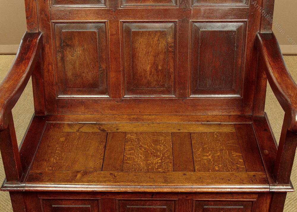 Lovely little late 19th.c. oak box settle or hall seat c.1880. Useful small size, just 40" long. High sloped backrest with six raised and fielded panels, moulded rails and mullions and topped with pointed finials. Sturdy shaped arms with rounded terminals raised on the square front stiles. Flat panelled seat lifting to reveal useful storage space for boots and shoes etc. Raised and fielded panels to the front, sides and rear below the seat. Repairs to the feet, otherwise excellent colour and condition, cleaned and waxed in our workshops.