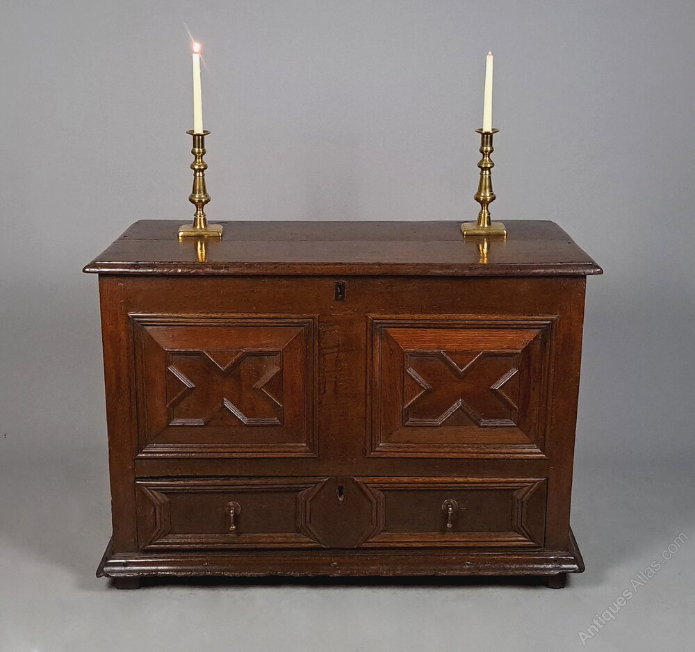 Marks, dings, scuffs and minor losses consistent with age and use. The lock to the lower drawer is original. The lid opens to reveal the original oak candle box. Some wooden straps/reinforcement have been added to the underside of the lid – probably in the 19th century – just a belt and braces piece of restoration which is often seen on such early coffers.