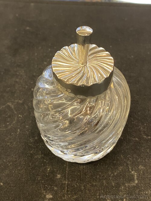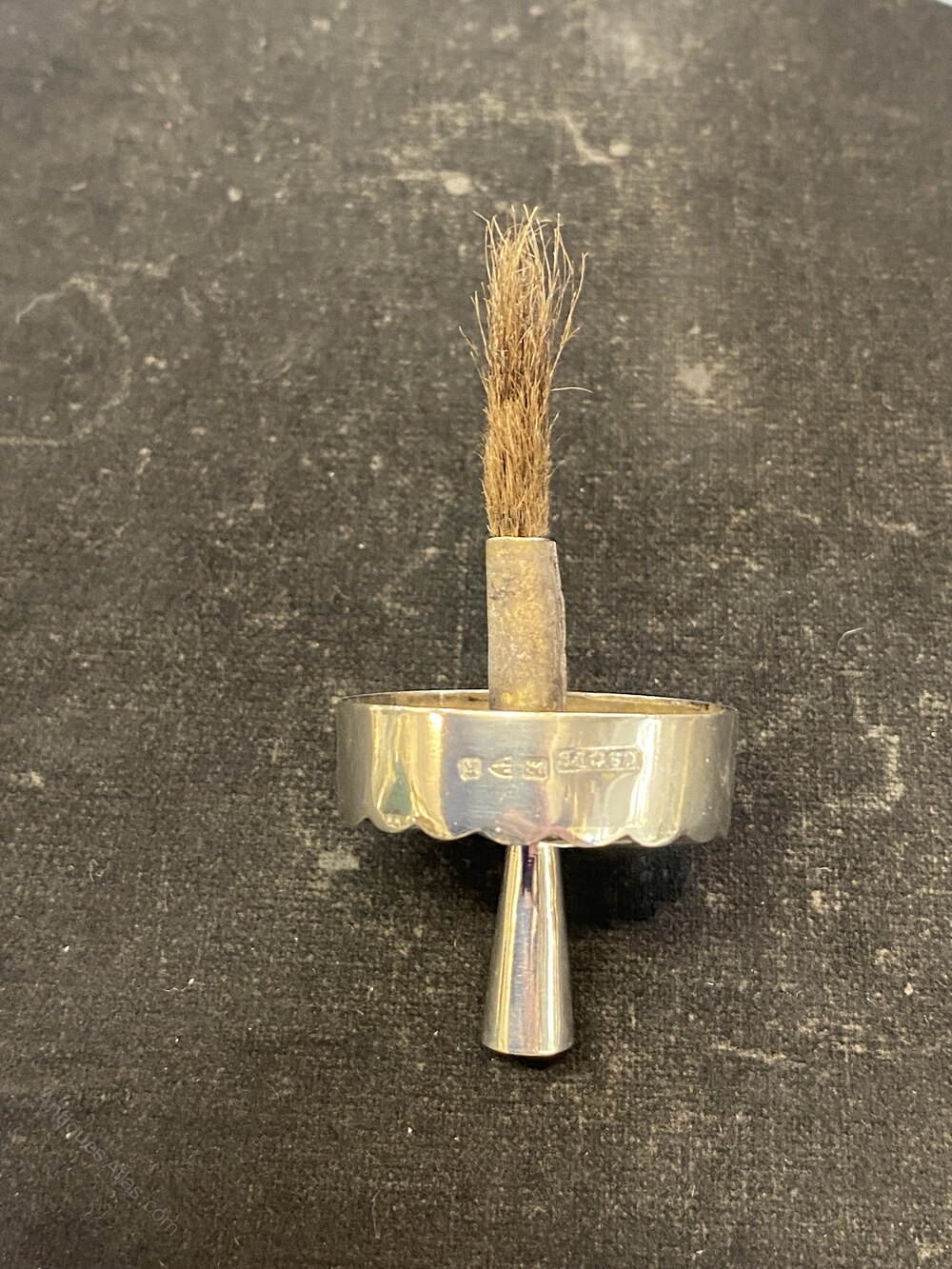 A glass glue pot, with silver top containing brush, hallmarked for Chester 1900