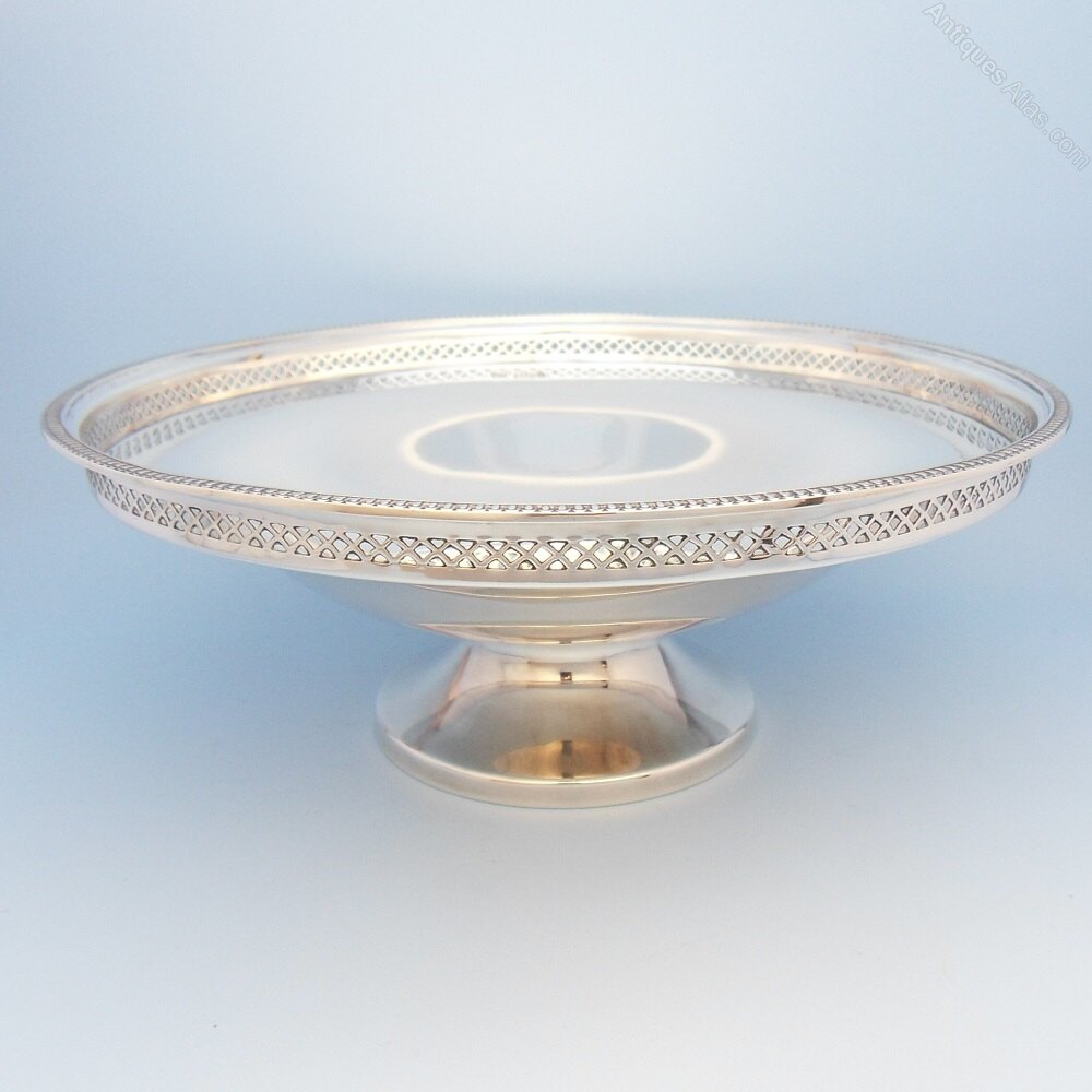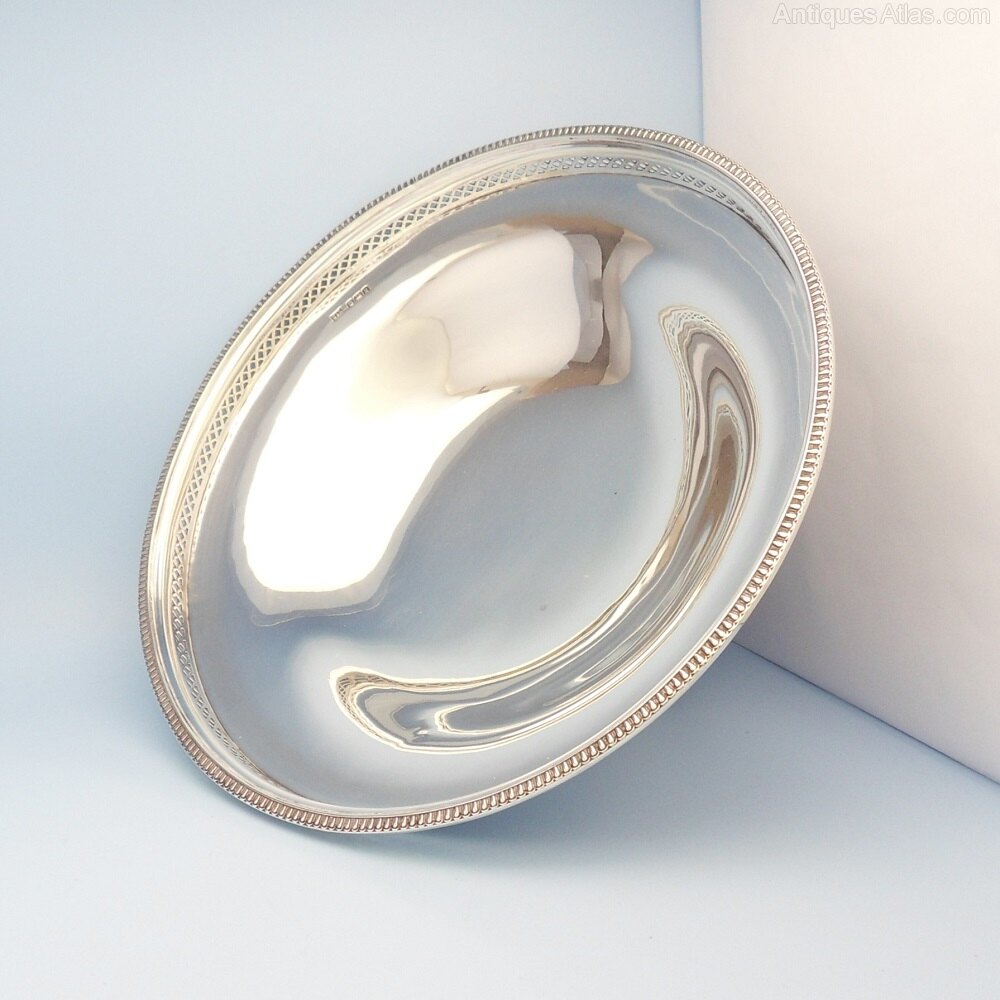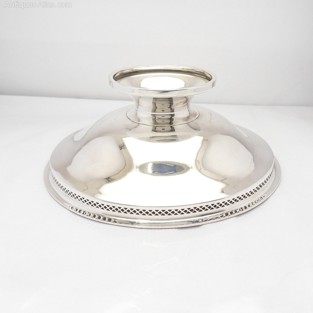 A super stylish silver pedestal dish or bowl with smooth polished interior and a smart pierced decoration gallery. The bowl of the dish is nicely shaped with gently curved sides and a deeper centre, all smoothly polished with a great shine. The gallery is pierced with a pattern of triangles and ribbed and beaded edge adds more interest and shine to the rim of the bowl. A simple smooth pedestal base completes the smart and elegant design.