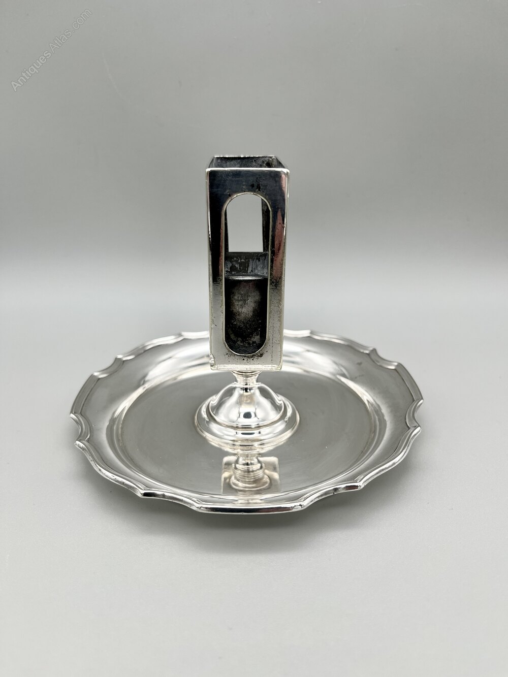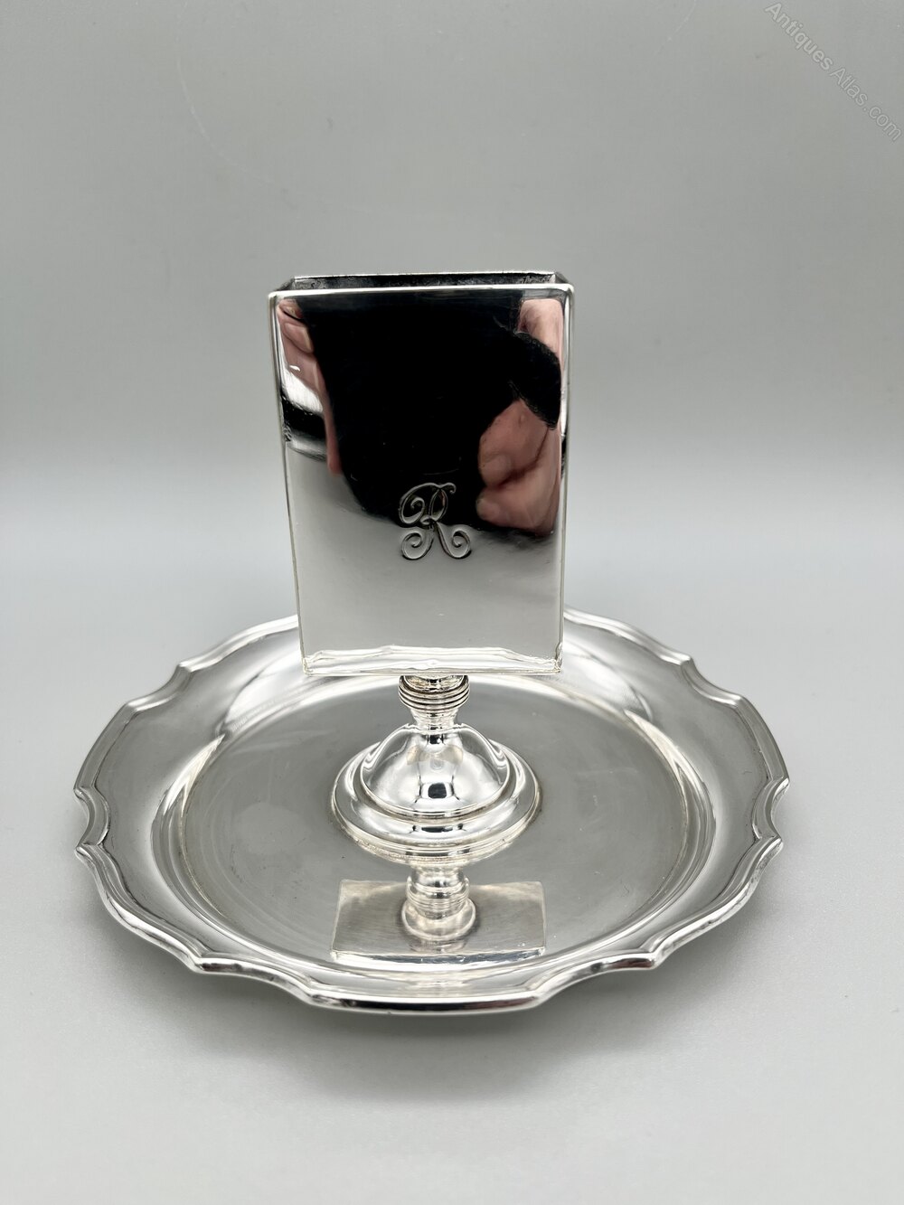 This is a smart late Victorian Silver Plate Matchbox Holder and Stand. The oblong matchbox holder is on a short pedestal stem that rises from the centre of a broad shallow dish with a scalloped rim. One side of the matchbox holder is engraved with a letter R below a crown, suggesting that this was perhaps originally in a hotel or members' club, which would make sense for a holder of this type.