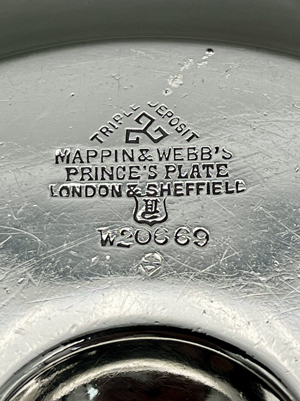 The underside of the base is clearly marked with Mappin & Webb's Prince's Plate, Triple Deposit, London & Sheffield and the Gothic date letter y, which gives us a date around 1899/1900.